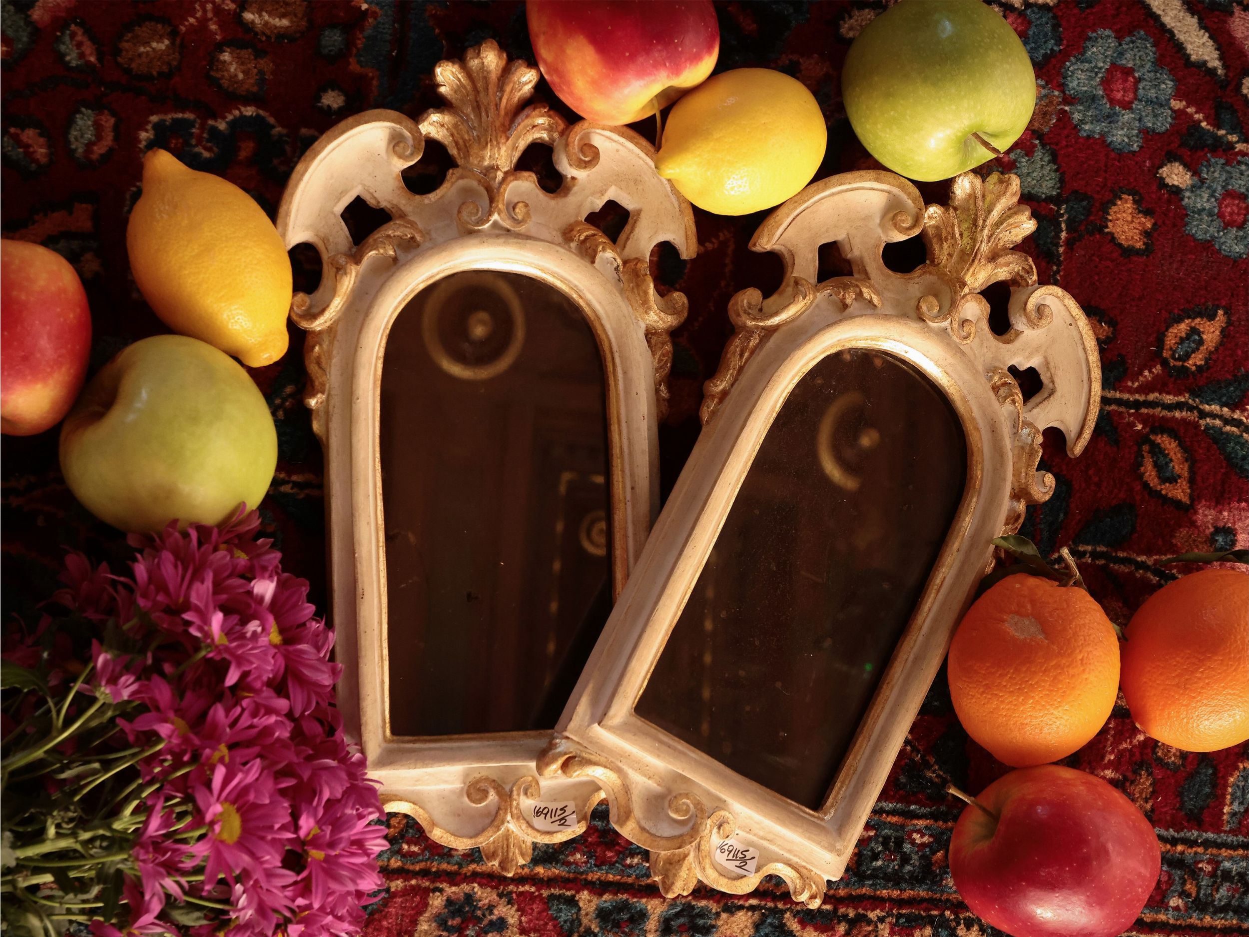Coppia di piccole specchiere in legno intagliato, laccato e dorato
