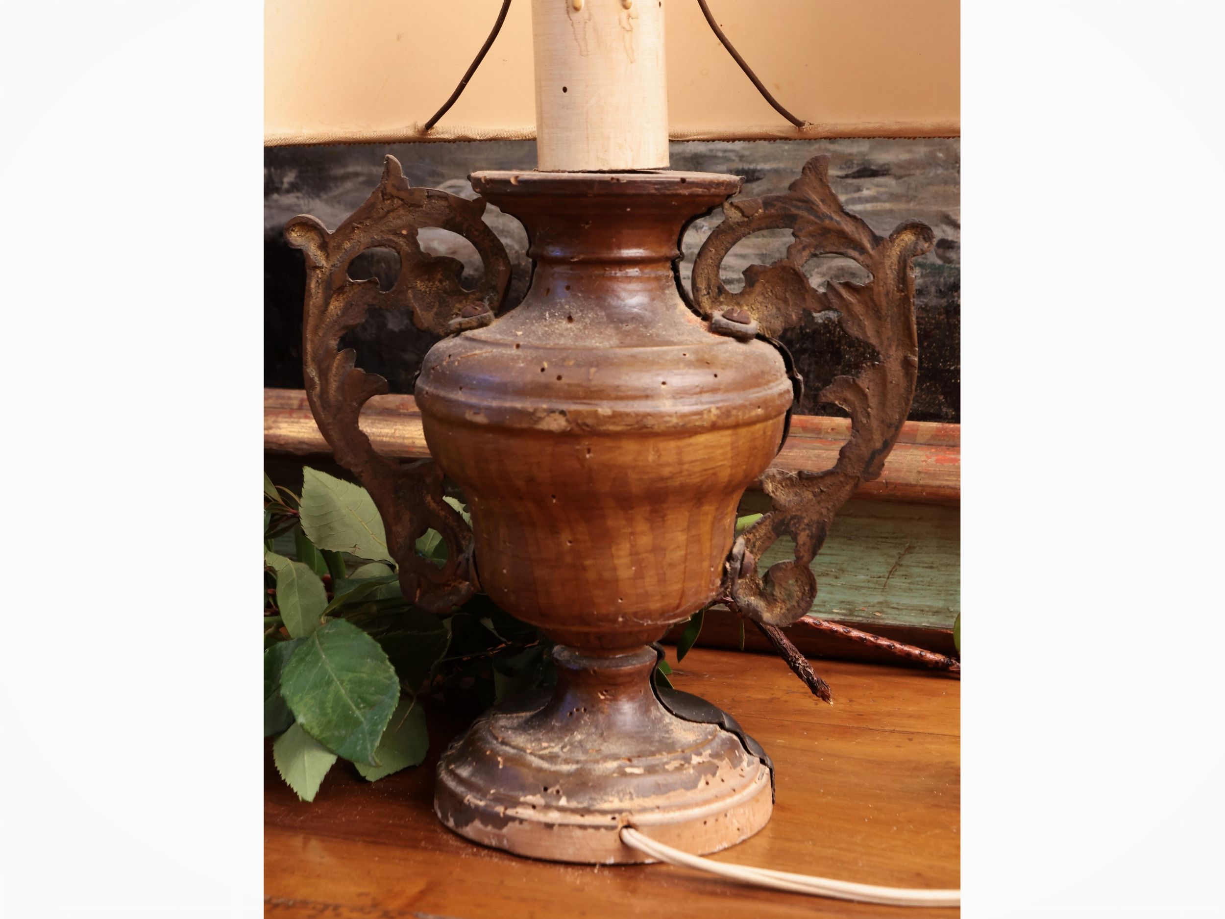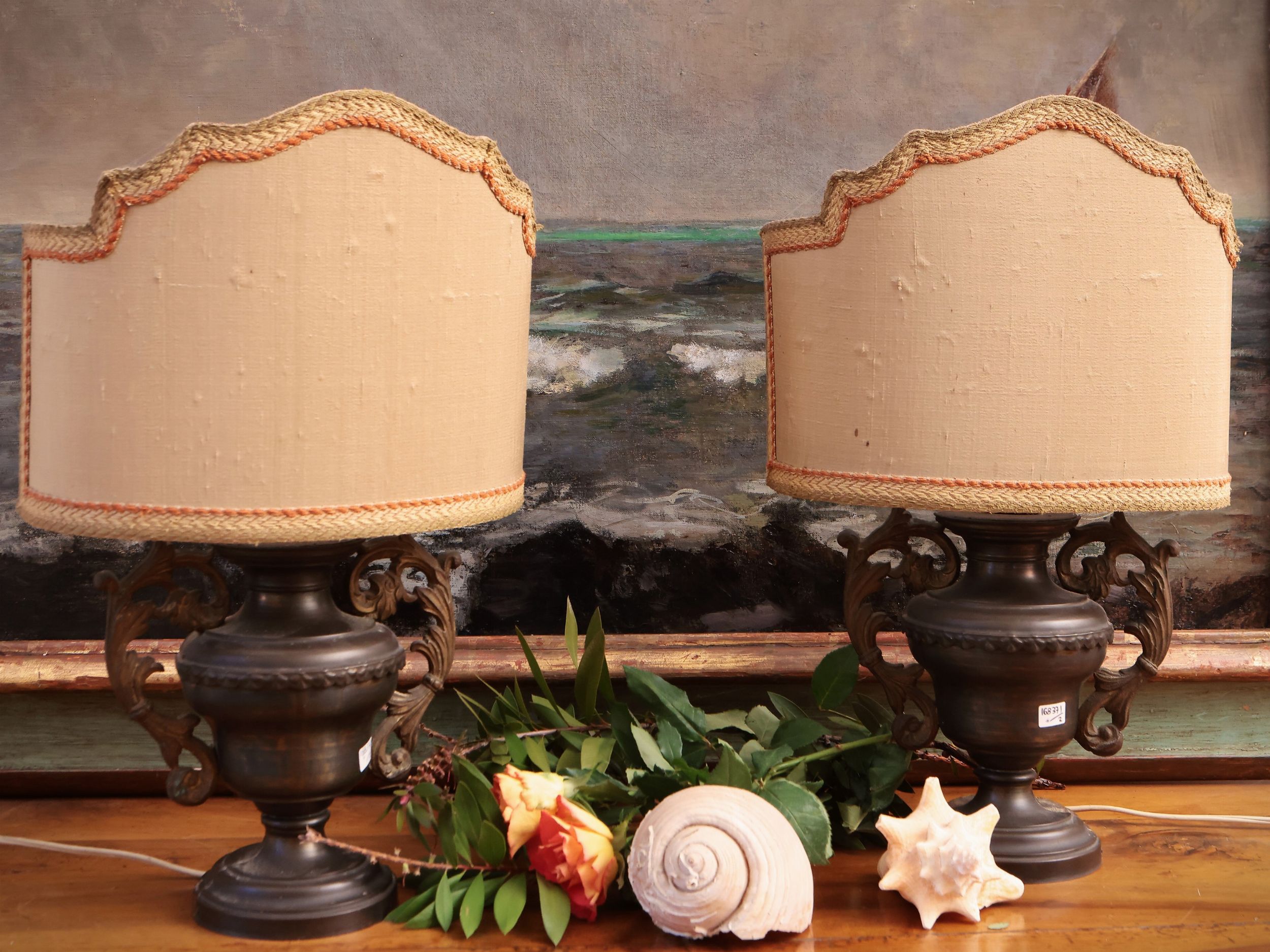 montate a lume, con paralume sagomato in tessuto color avorio con dettagli in passamaneria, alcuni difetti