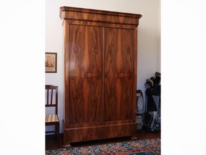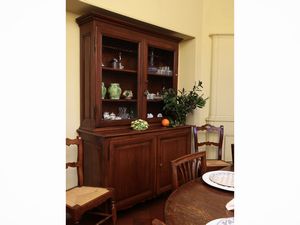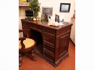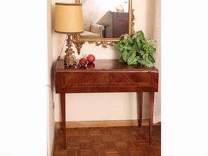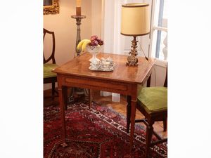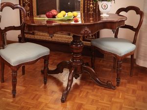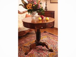 h cm 77x118x64 metà del XIX secolo piano ovale sagomato, sostegno centrale tornito su quattro piedi a doppia voluta, [..]