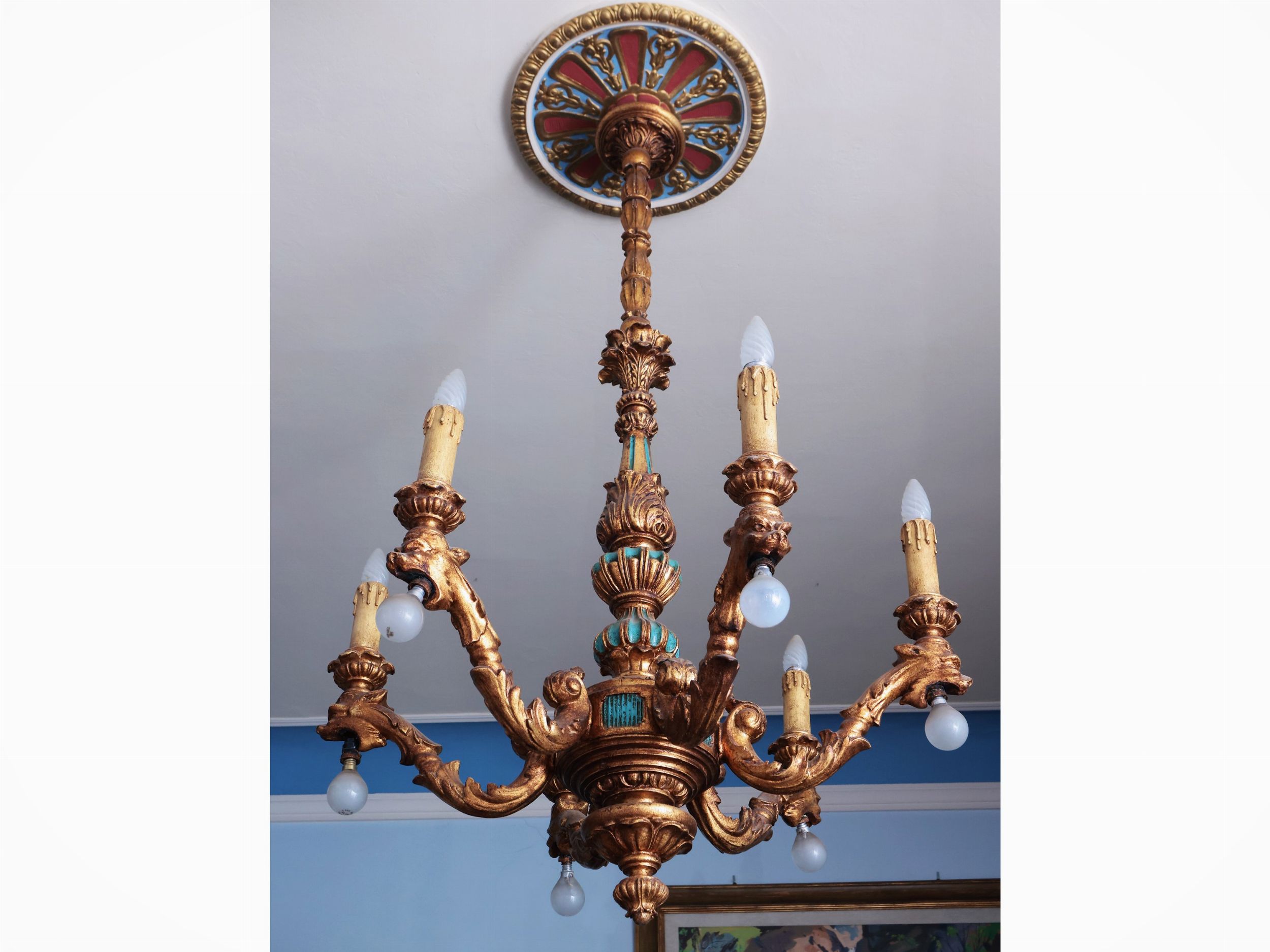 Lampadario in legno intagliato e dorato