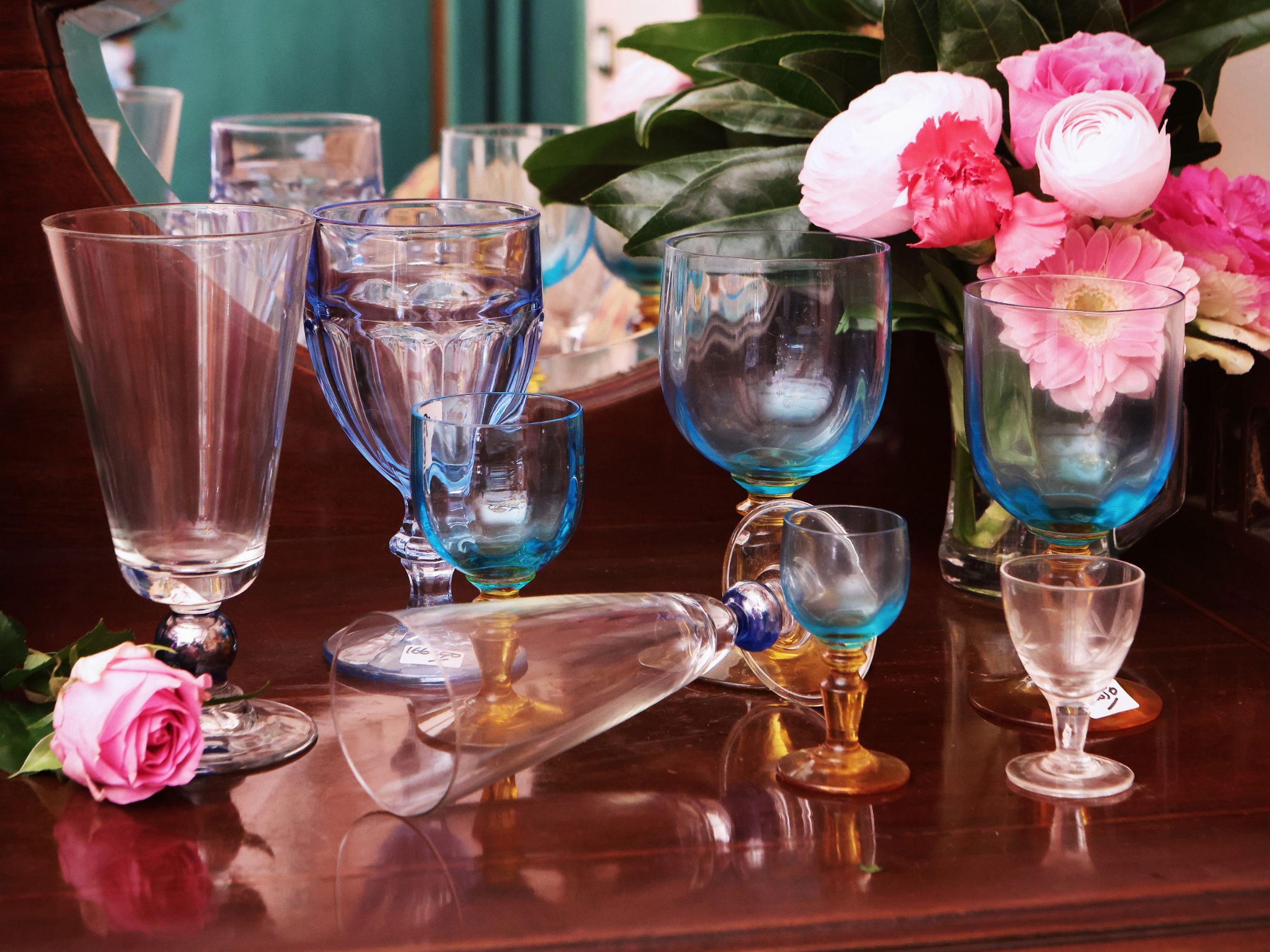 composta da un servito nei toni del turchese e dell'ambra, completo per sei persone con 6 calici da acqua, 6 da vino rosso, 6 da vino bianco ed un assortimento di bicchierini da liquore di più gradazioni, abbinato ad una serie di 12 calici in vetro azzurro