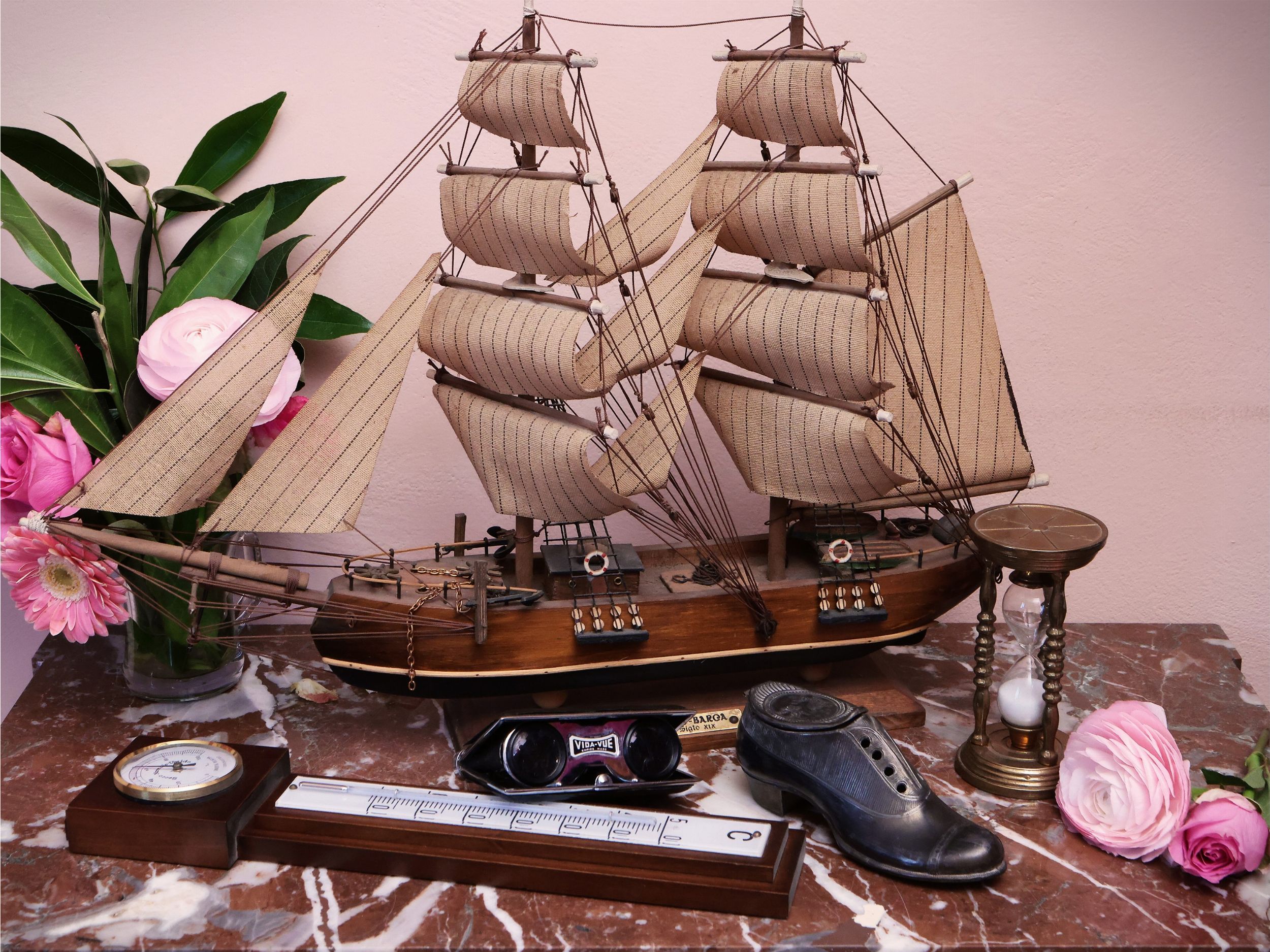 XIX/XX secolo tra cui un veliero realizzato in legno, alcuni binocoli da teatro ed un calamaio in peltro modellato come una scarpina