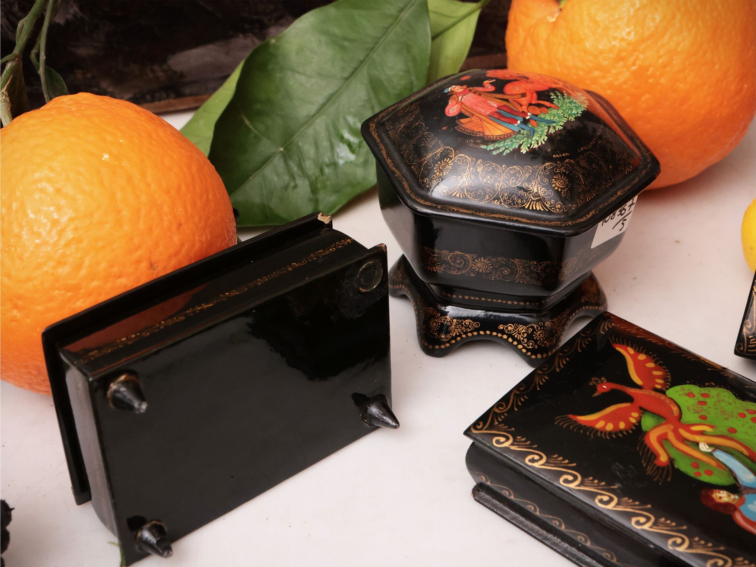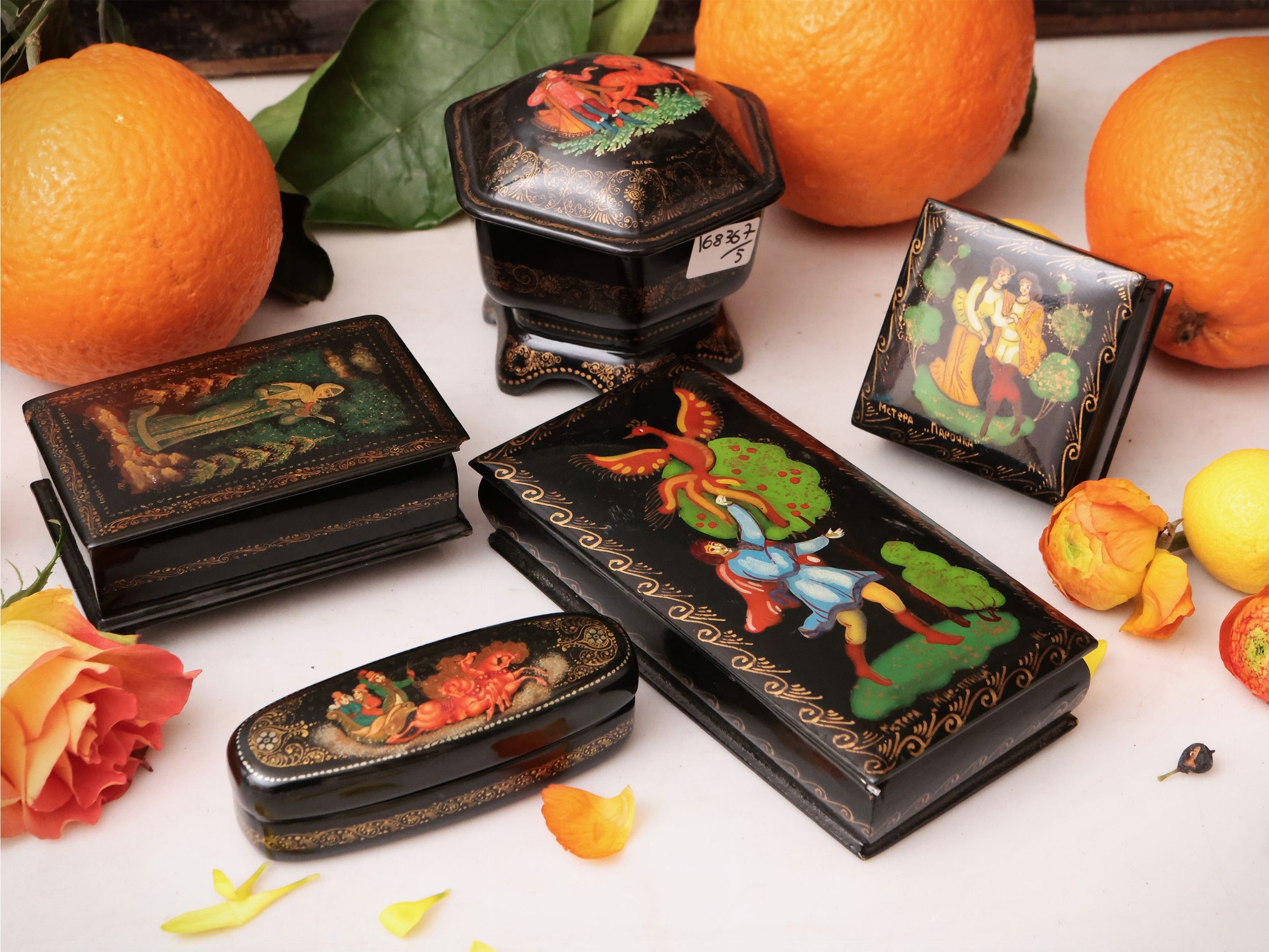 Russia, XX secolo dipinte in policromia con scene di genere su fondo nero, di varia foggia e dimensione