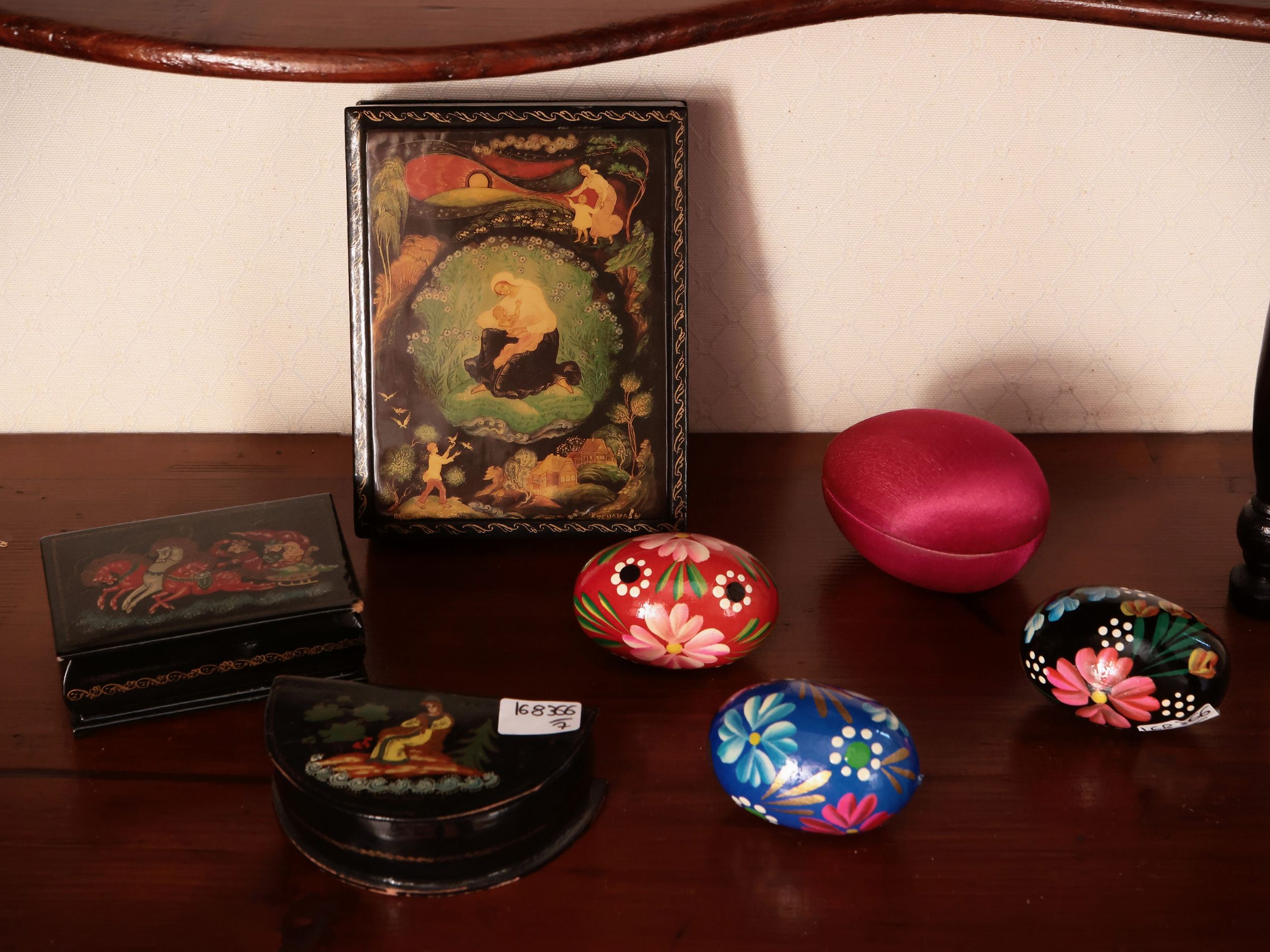 Russia, XX secolo dipinte in policromia con scene di genere su fondo nero, di varia foggia e dimensione, abbinate ad una serie di uova di gusto simile, una in argento
