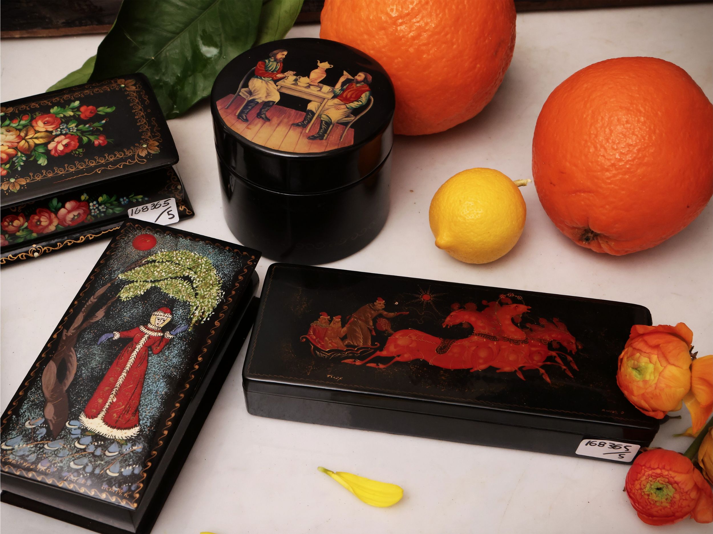 Russia, XX secolo dipinte in policromia su fondo nero, alcune con scene di genere, altre con motivi floreali, di varia foggia e dimensione