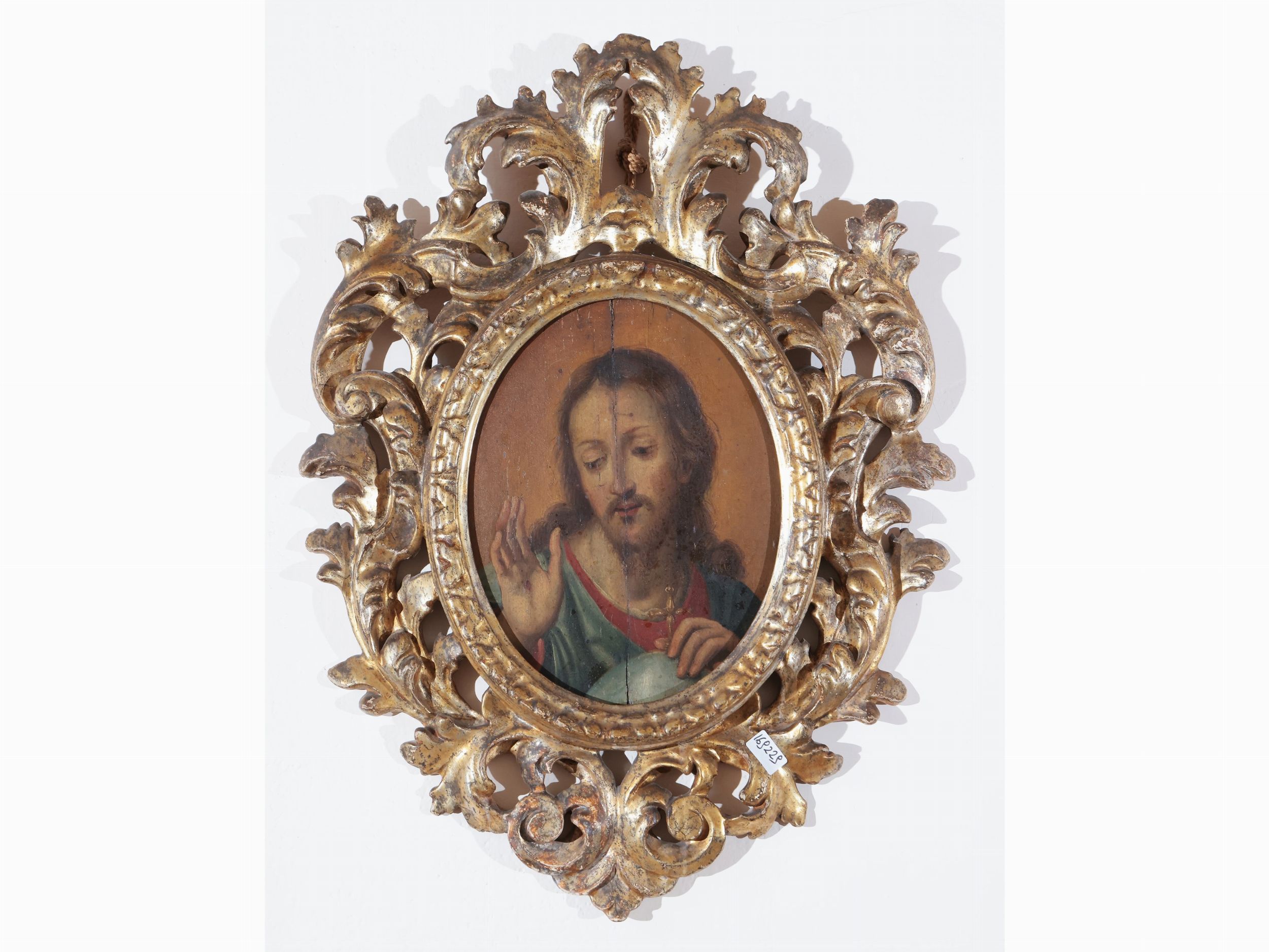 olio su tavola ovale (difetti alla tavola), in bella cornice in legno intagliato e dorato del XIX secolo