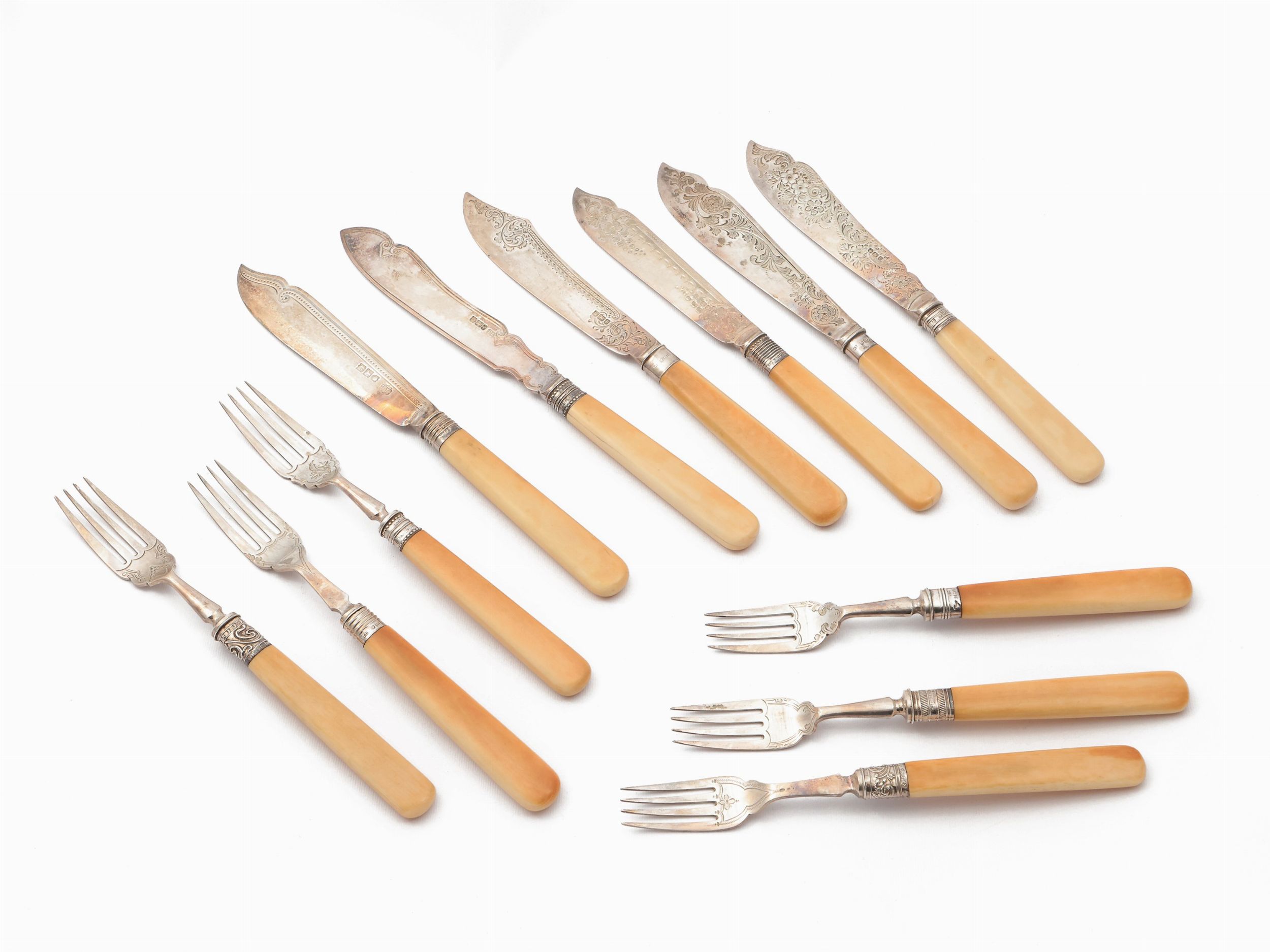 Inghilterra, fine del XIX/inizio del XX secolo ognuna cesellata con motivo floreale e vegetale con lievi differenze, composto da 6 forchette e 6 coltelli da pesce, contenuti entro cofanetto in legno originale con coperchio centrato da scudetto in ottone