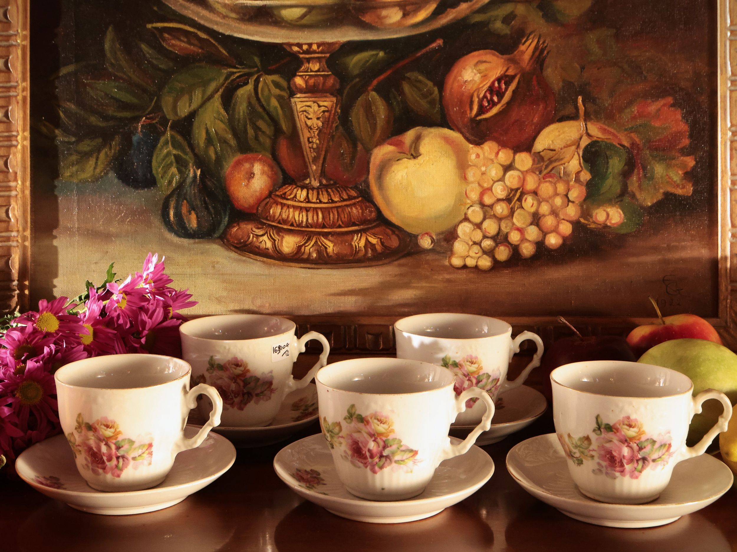 fine del XIX/inizio del XX secolo dipinto con tralci di rose, composto da 12 tazzine da caffè corredate da piattino (uno mancante) (12)