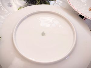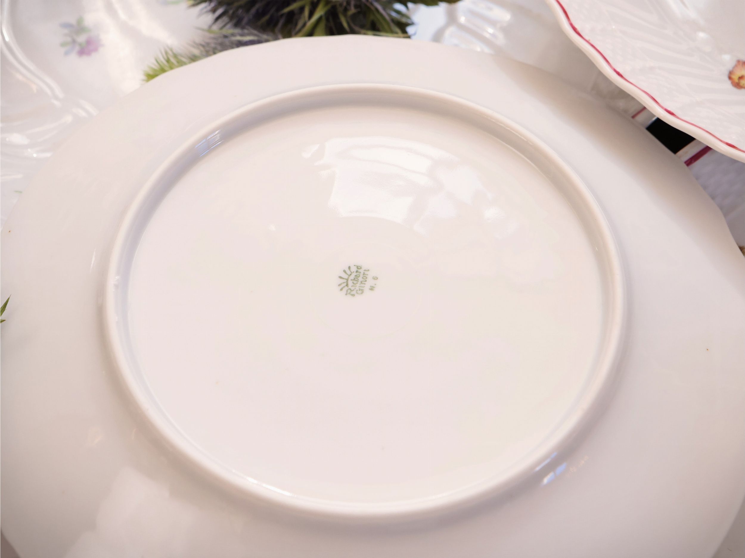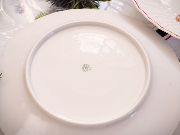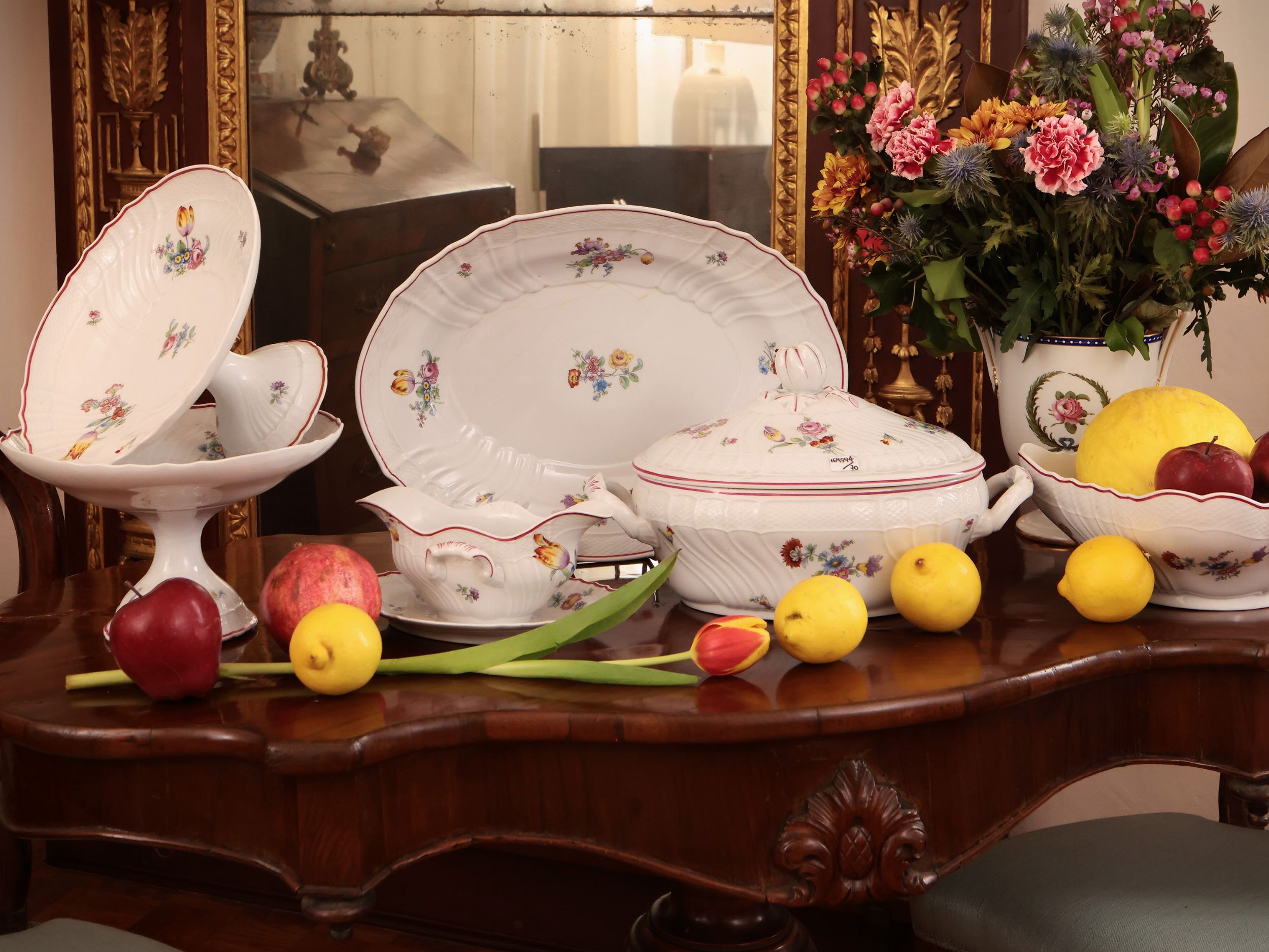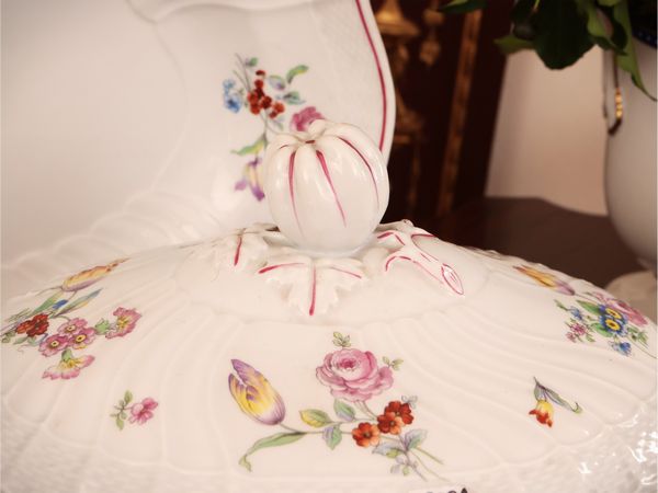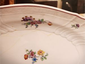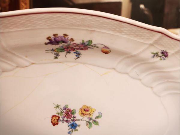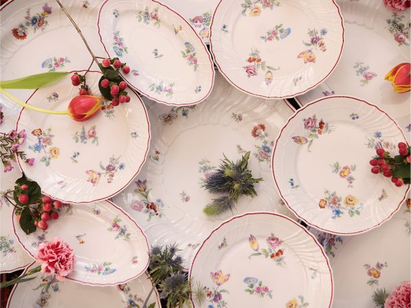 dipinto con motivo di fiori policromi e bordo magenta, composto da 35 piatti piani, 12 piatti fondi, 11 piattini da antipasto, una zuppiera, una insalatiera, 6 vassoi ovali a scalare ed uno rotondo, 2 alzatine ed una salsiera
