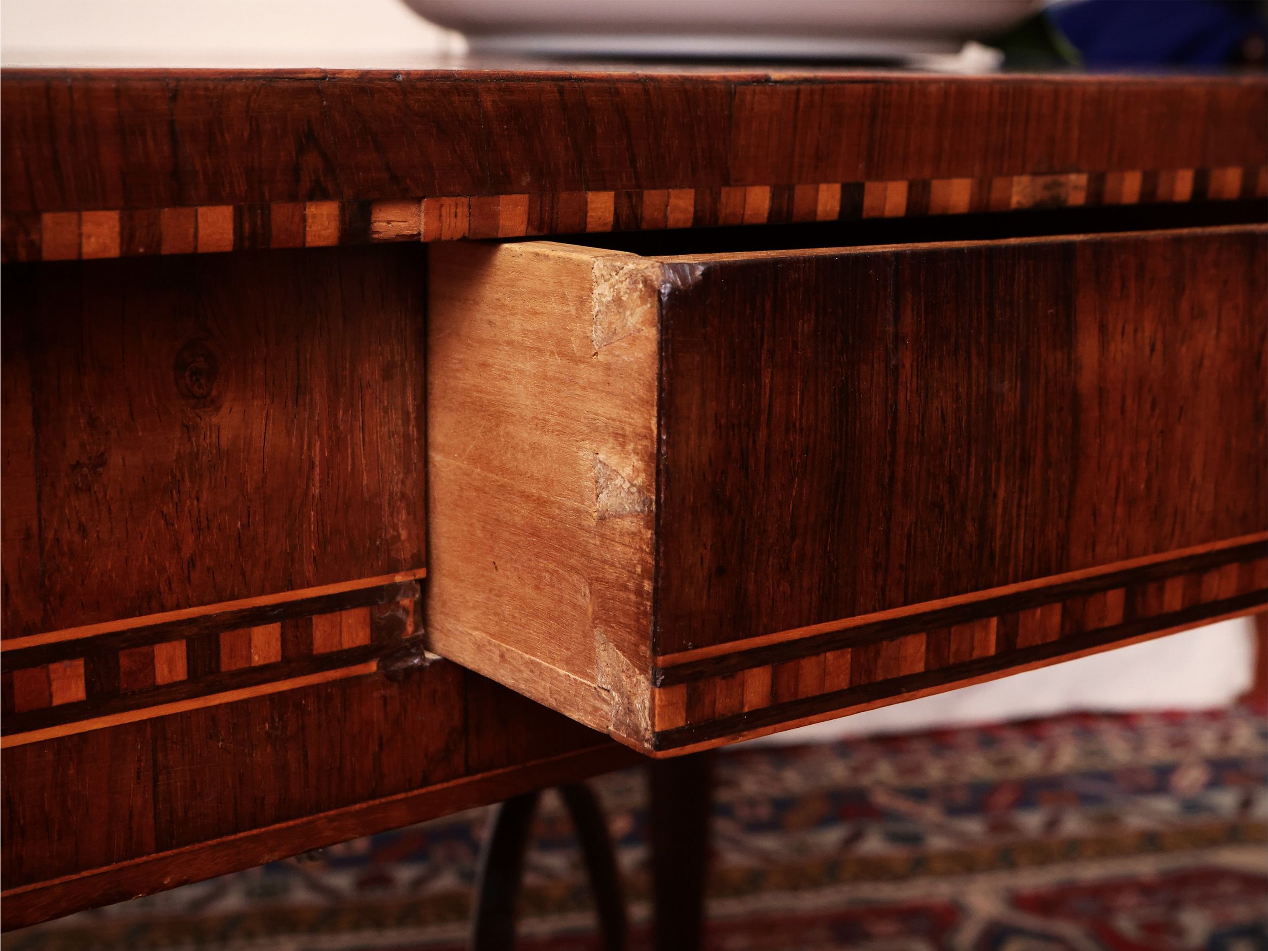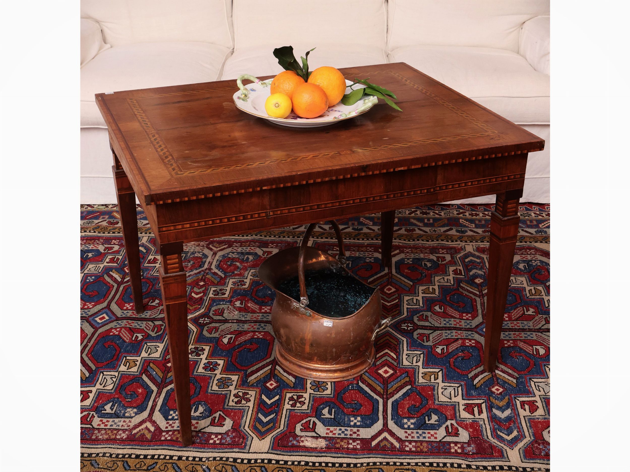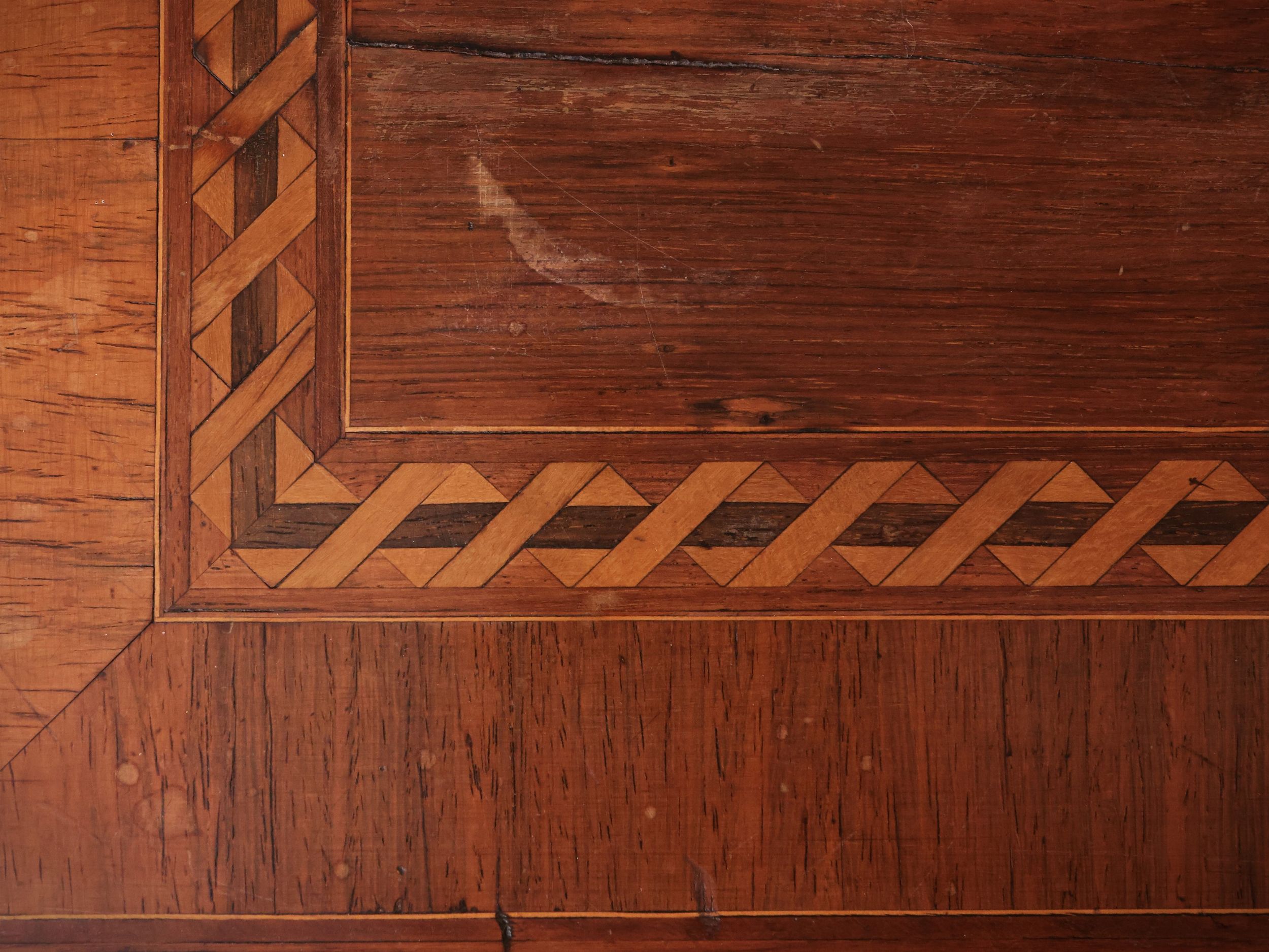 fine del XVIII secolo piano intarsiato in legni di frutto con filettature a nastro che si ripetono nella fascia, gambe a faretra (abbassate), alcuni difetti