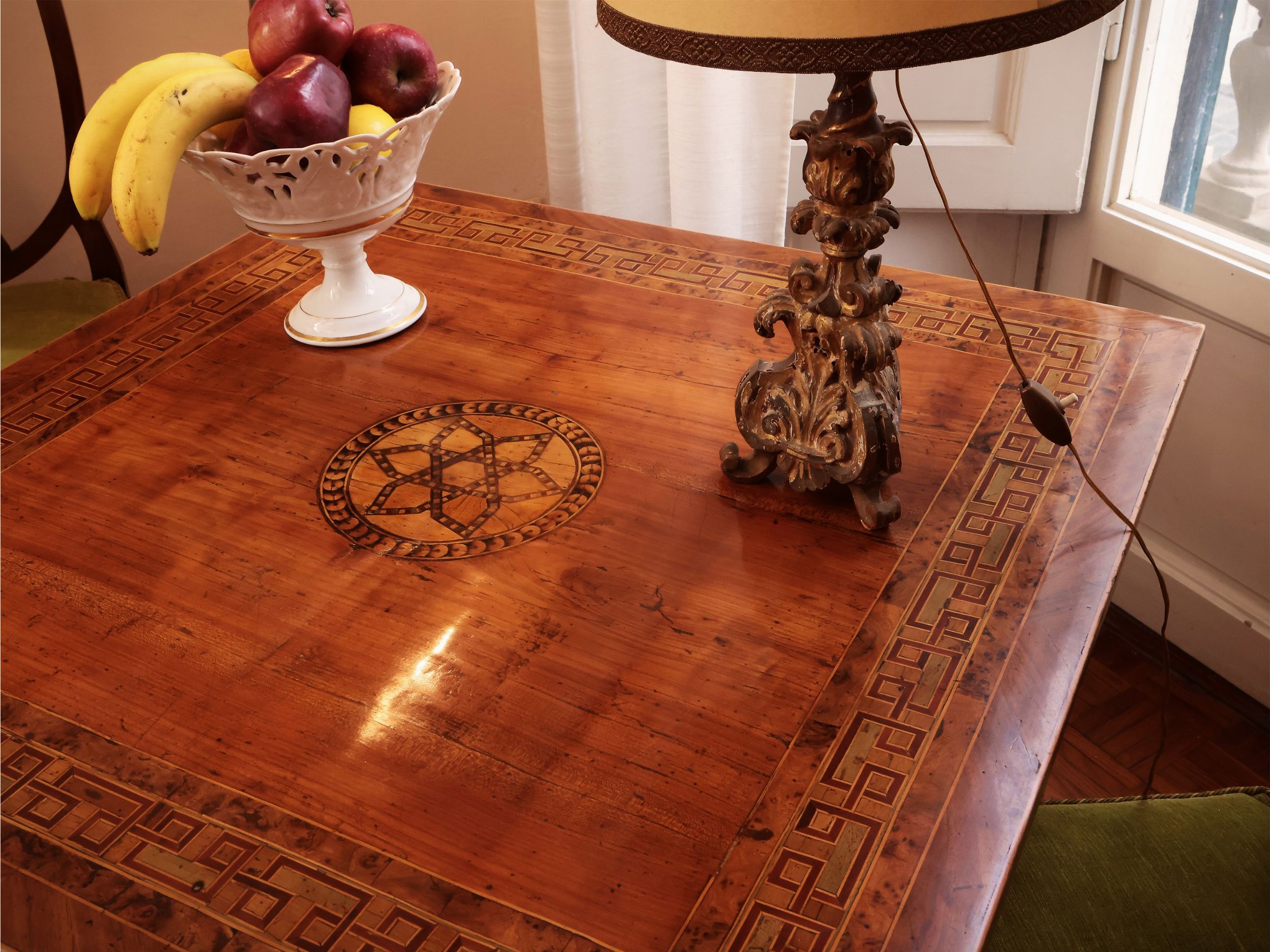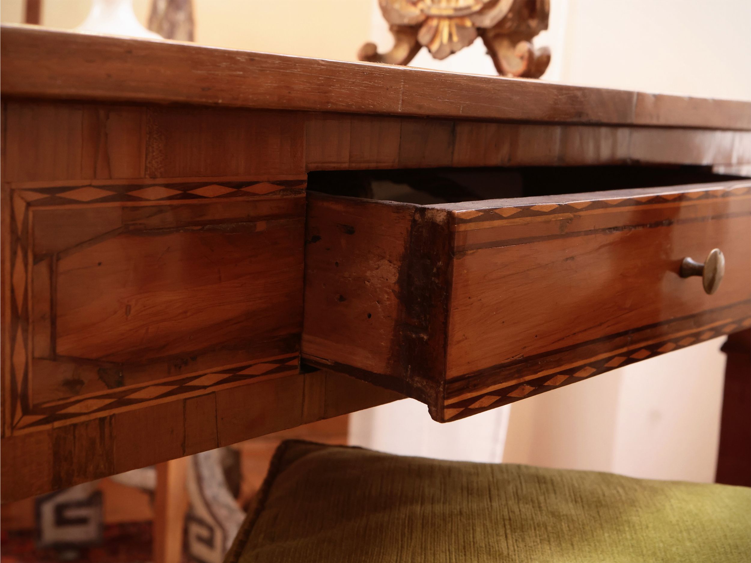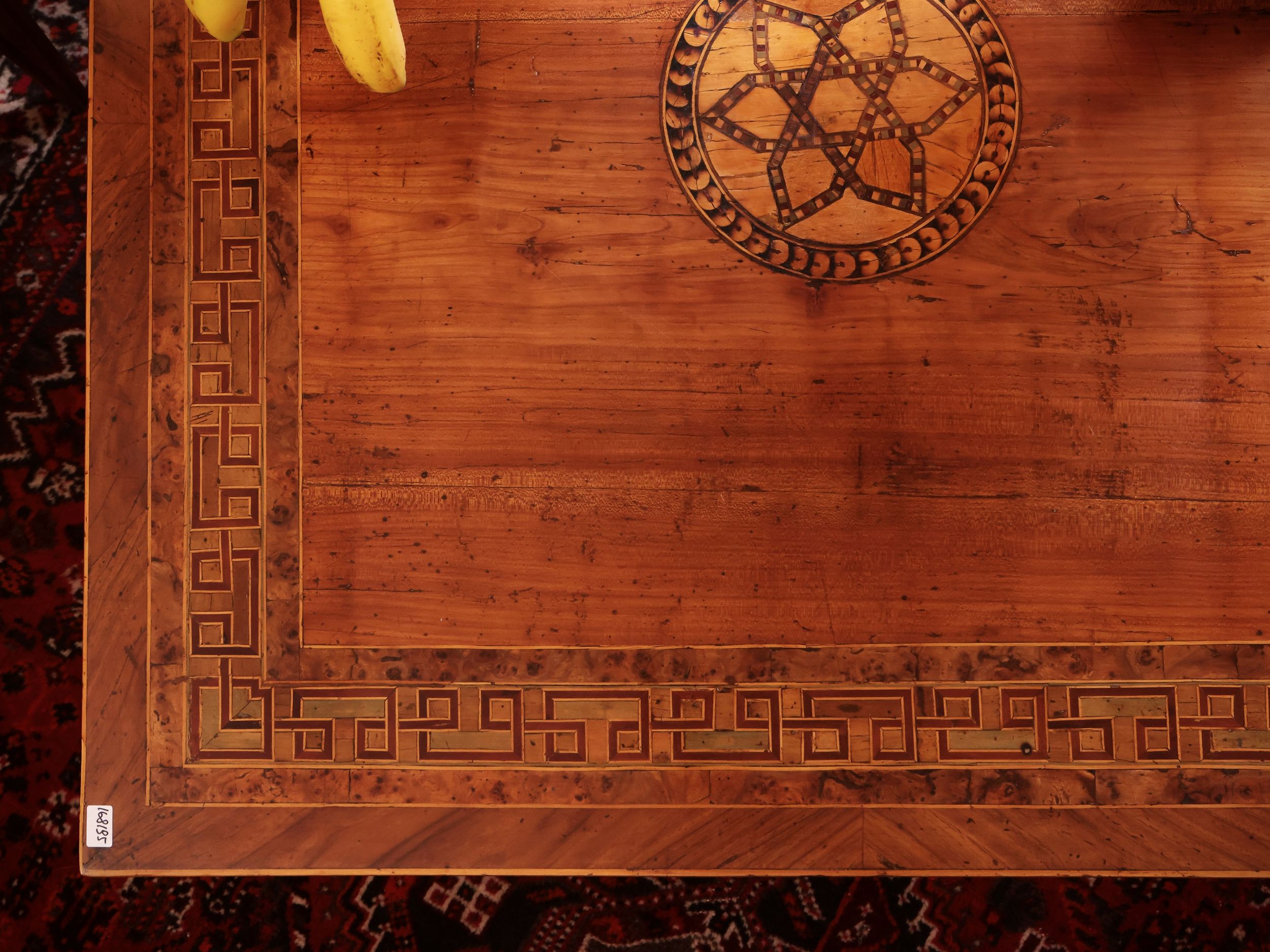 h cm 74x84x84 fine del XVIII secolo piano intarsiato con ampia fascia con motivo a greca, centrato da rosone a sei punte, un cassettino nella fascia, gambe a faretra con collarino, lievi difetti
