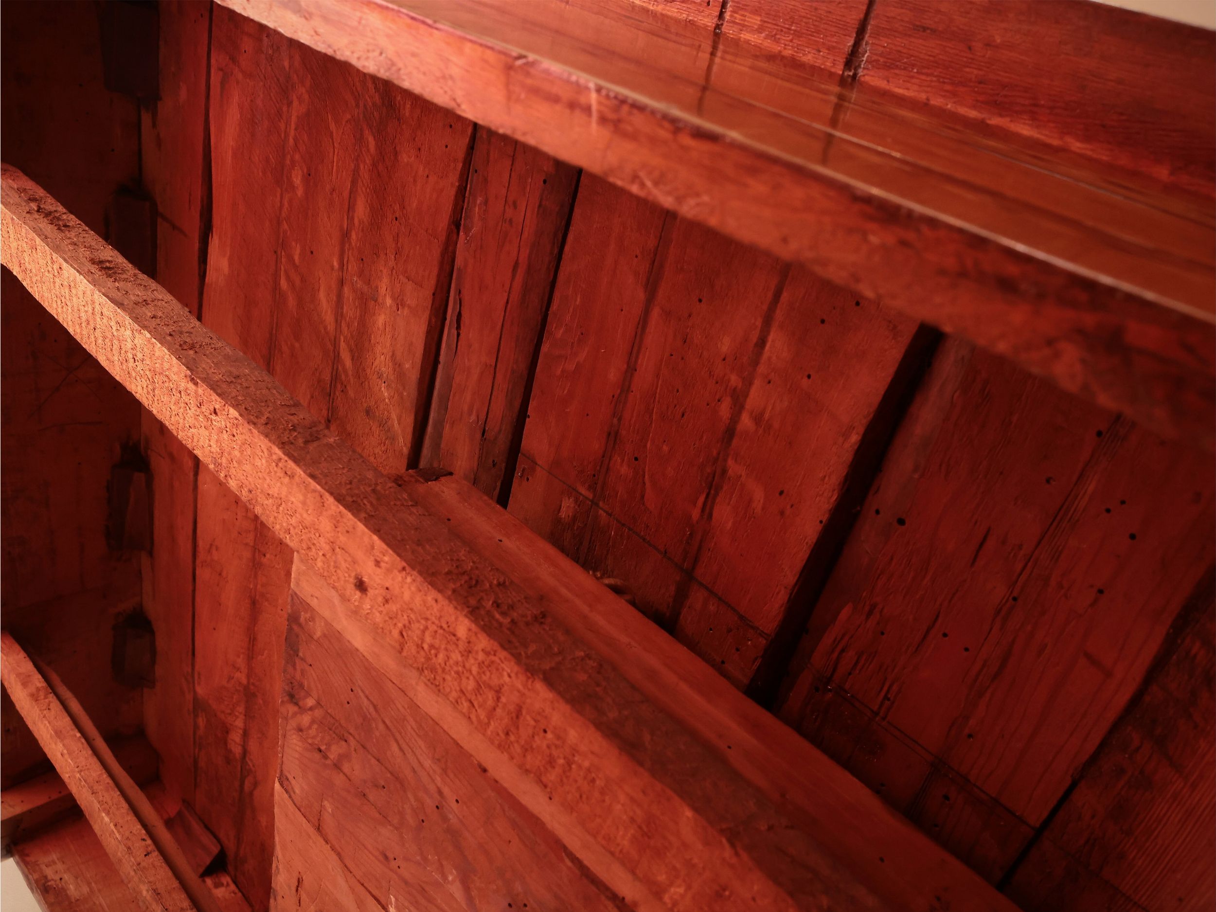 Tavolino impiallacciato in noce, ciliegio ed altre essenze