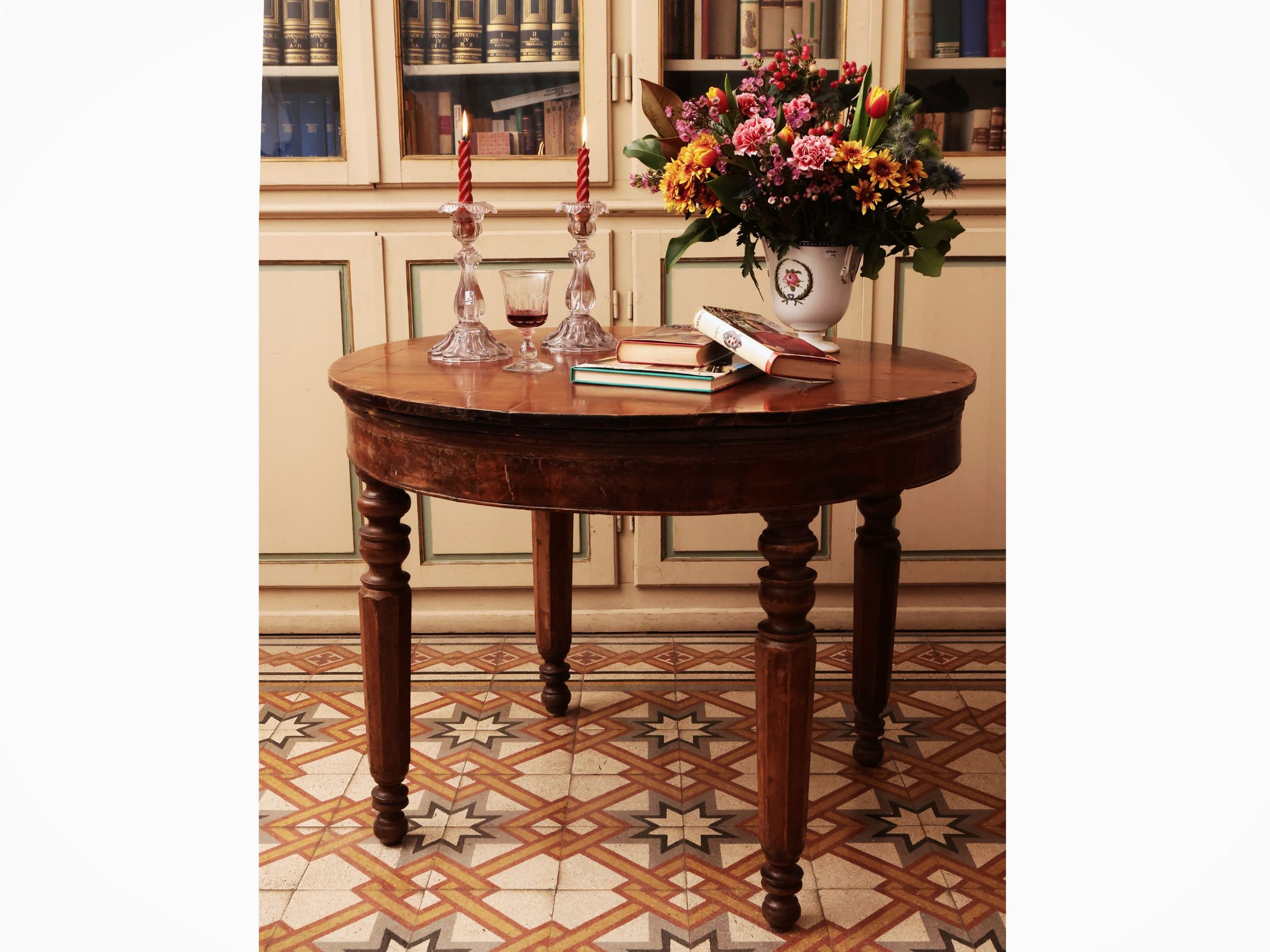 Tavolino rotondo impiallacciato in noce e radica di noce