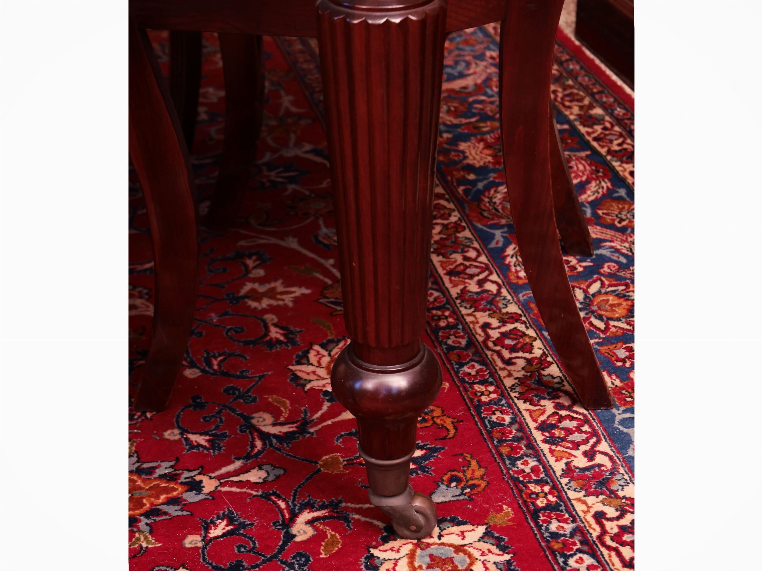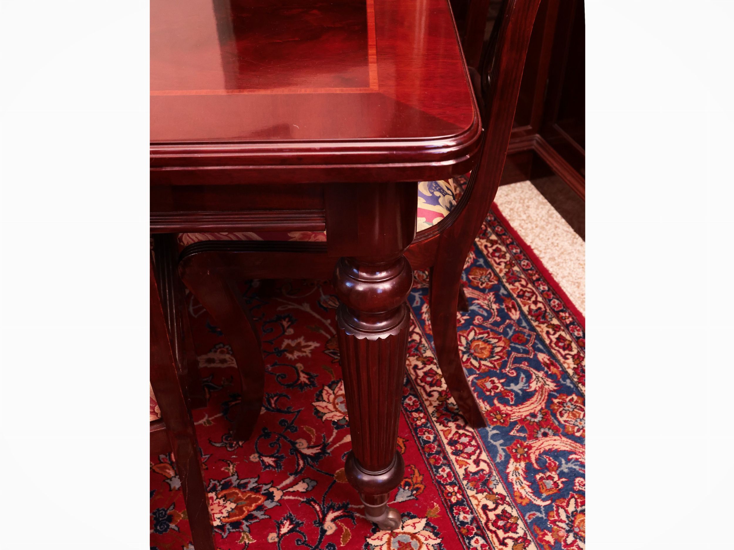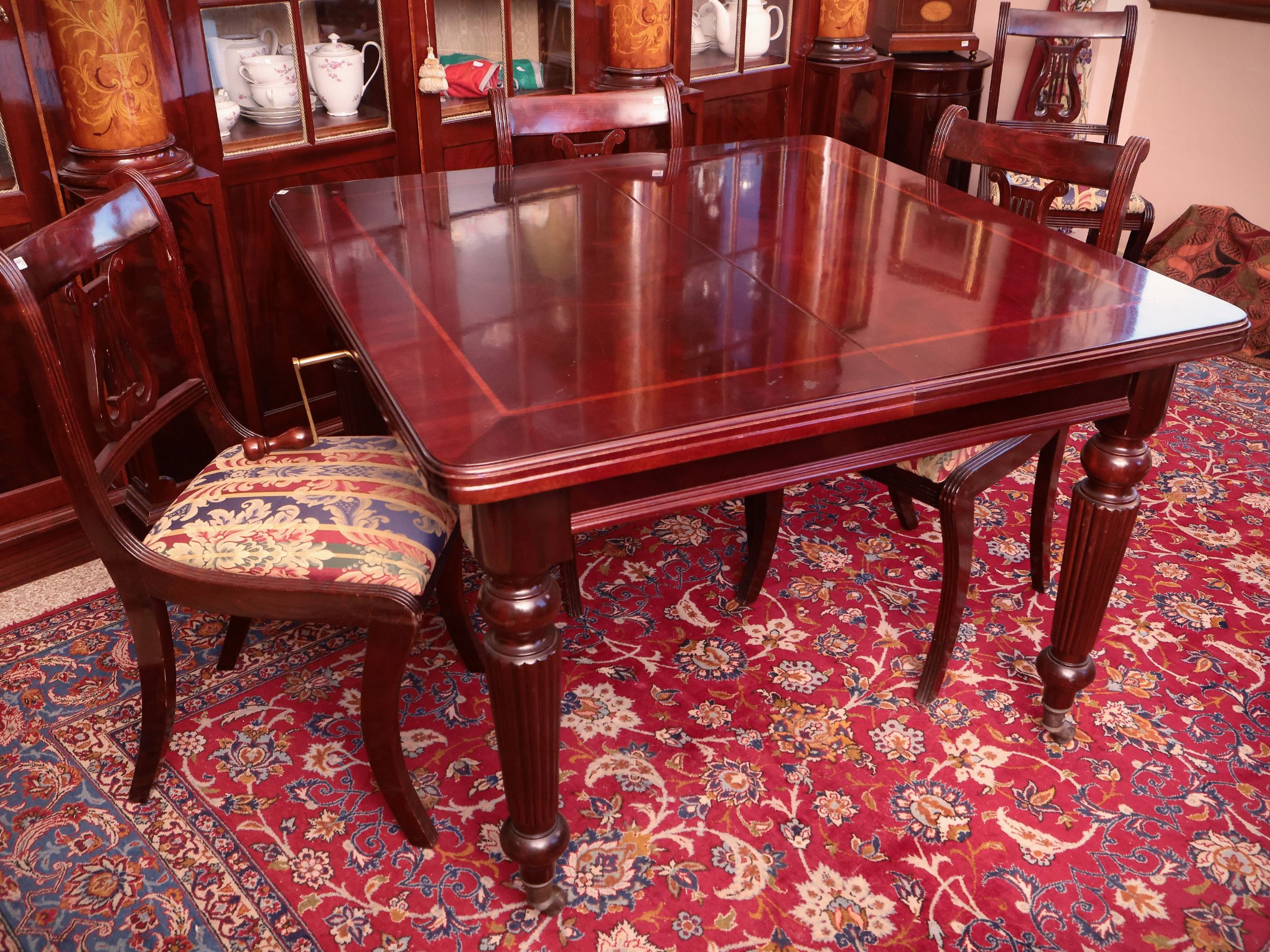 piano rettangolare intarsiato con filettature e angoli arrotondati, gambe a colonna scanalata poggianti su ruotine, lievi difetti