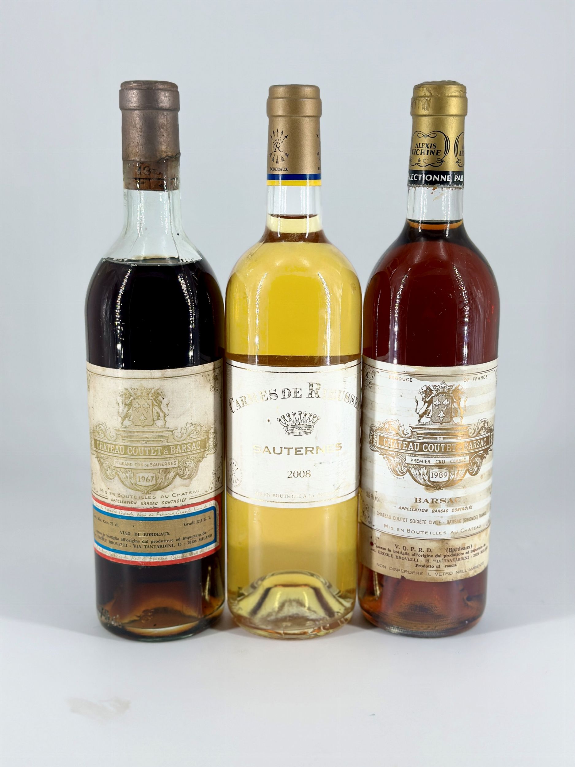 Francia, 0,75 Francia, Château Coutet à Barsac - 2 bottiglie (bt), annate 1967 e 1989. Livello: sommità della spalla (TS) e entro il collo (WN). Condition report: etichette macchiate e capsula in buone condizioni. Francia, Château La Tour Blanche - 1 botti