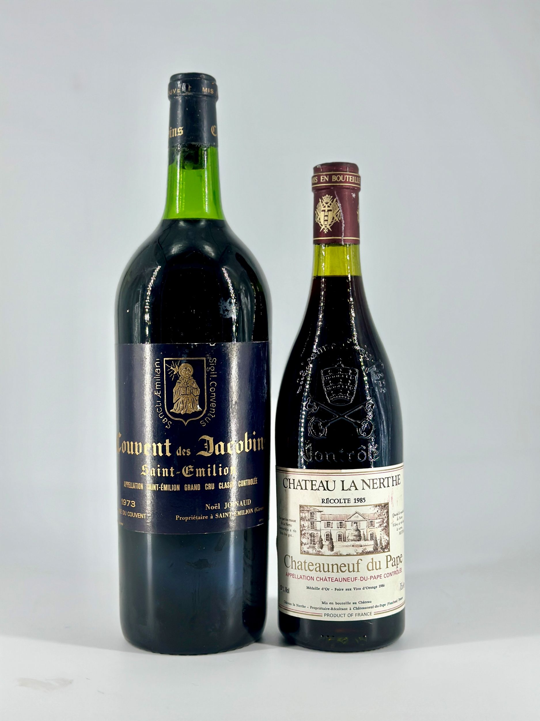 Francia, 0,75-1,5 1973-1985 a) Francia, Chateau La Nerthe - 1 bottiglia (bt), annata 1985. Livello: entro il collo (WN). Condition report: etichetta e capsula in ottime condizioni. b) Francia, Counvent des Jacobins - 1 Magnum(Mg), annata 1973. Livello: collo inferio