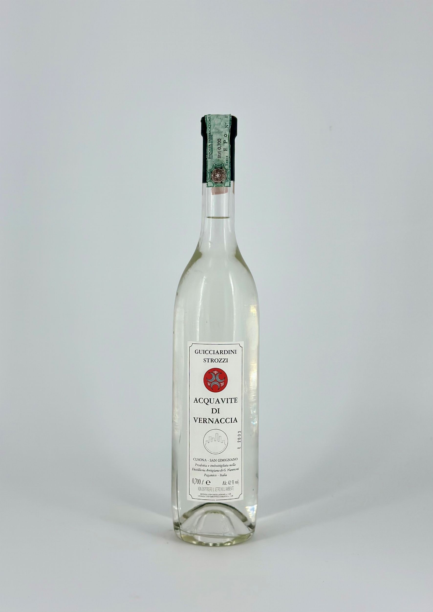 Guicciardini Strozzi, Acquavite di Vernaccia Toscana, Acquavite di Vernaccia 0,70 cl - 42% vol. Livello: entro il collo (WN), livello di colmatura standard. Condition report: etichetta e capsula in perfette condizioni.