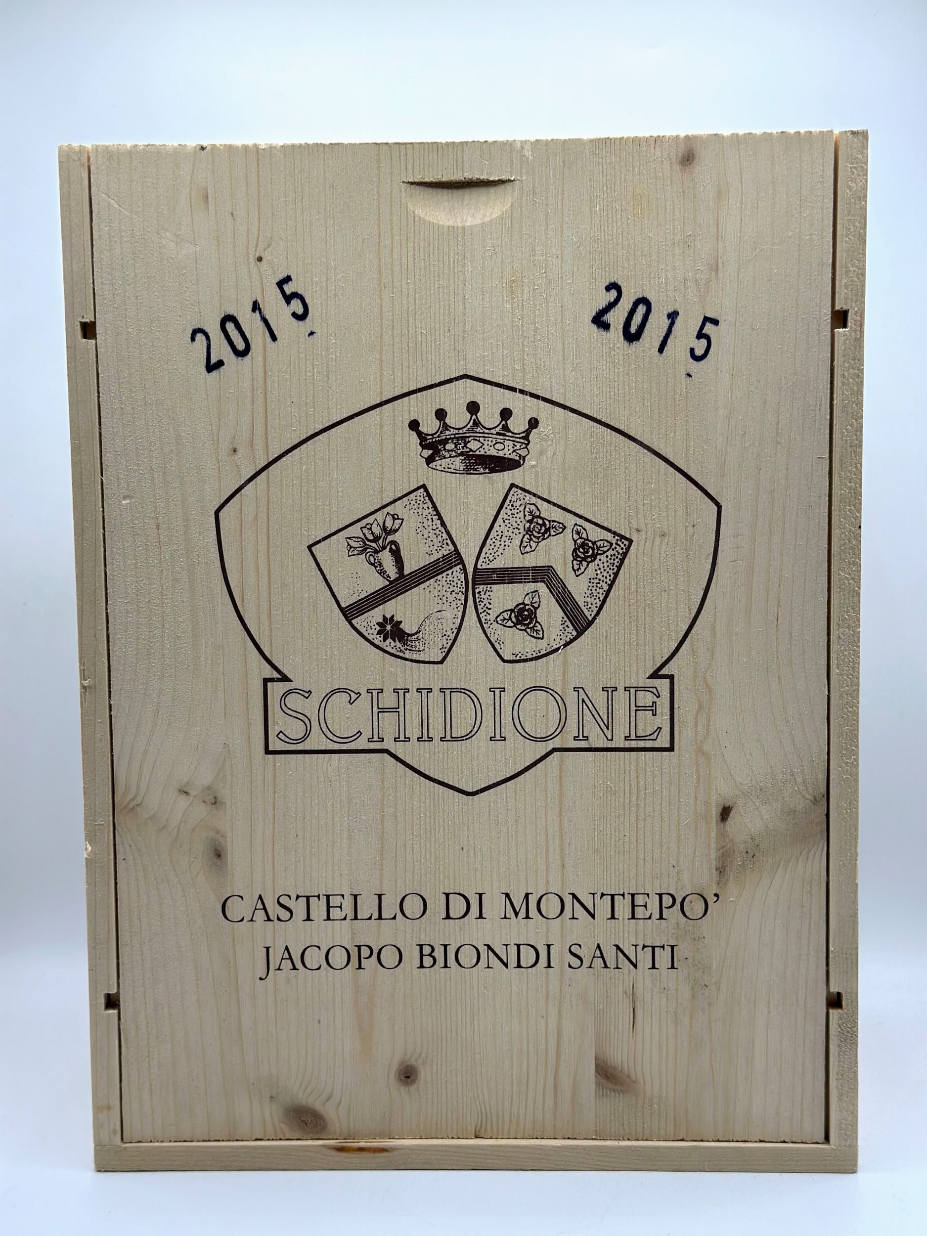 2015 Toscana, Schidione - 6 bottiglie (bt), annata 2015. Livello: entro il collo (WN). Confezione: scatola di legno originale (OWC). Condition report: etichetta e capsula in perfette condizioni.