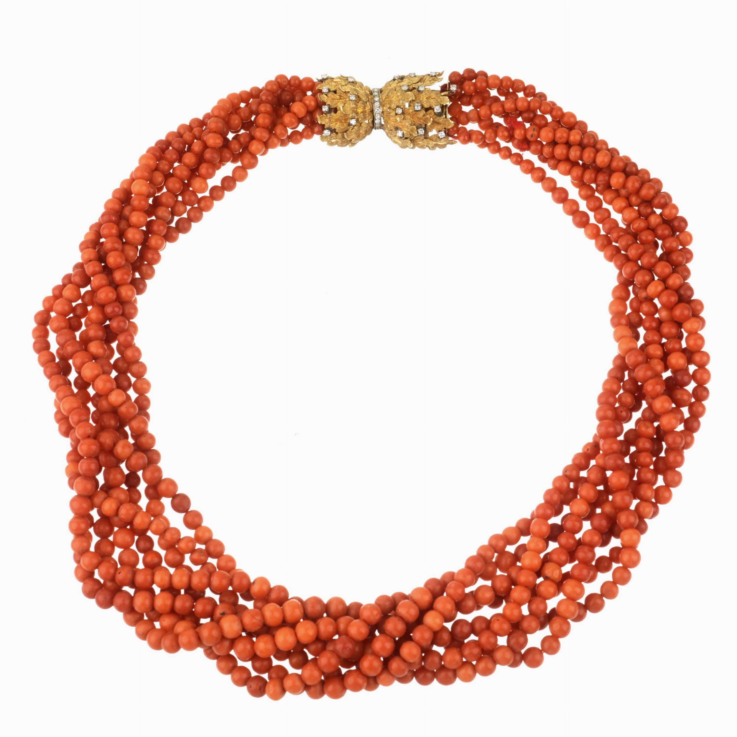 COLLANA TORCHON DI CORALLO composta da otto fili di boules in corallo di mm 4 circa, fermatura fiocco in oro giallo e bianco satinato 18kt impreziosita da diamanti taglio huit huit per ct 0.40 circa, lungh. cm 42, gr. 200