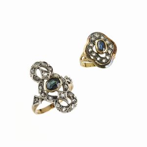 DUE ANELLI di cui uno in oro giallo, argento e oro bianco 18kt, in parte lavorato a incisione e impreziosito [..]