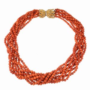 COLLANA TORCHON DI CORALLO composta da otto fili di boules in corallo di mm 4 circa, fermatura fiocco in oro giallo [..]