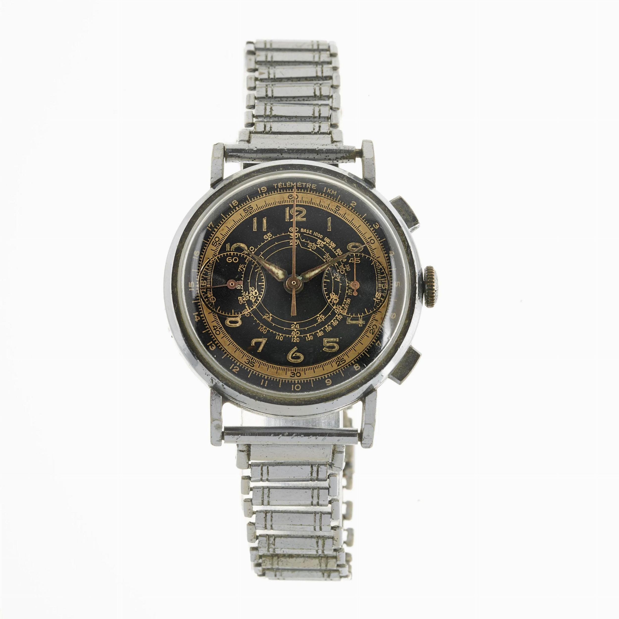 cassa in metallo, fondello a pressione marcato Boden Rostfreier Stahl, quadrante nero a settori ristampato, grafica oro, scala telemetrica e tachimetrica, due contatori, numeri arabi, movimento a carica manuale, bracciale a maglie in metallo non marcato e non coevo (difetti) con chiusura a scatoletta, lungh. interna massima cm 24 circa, vetro plastica. Diam. mm 36