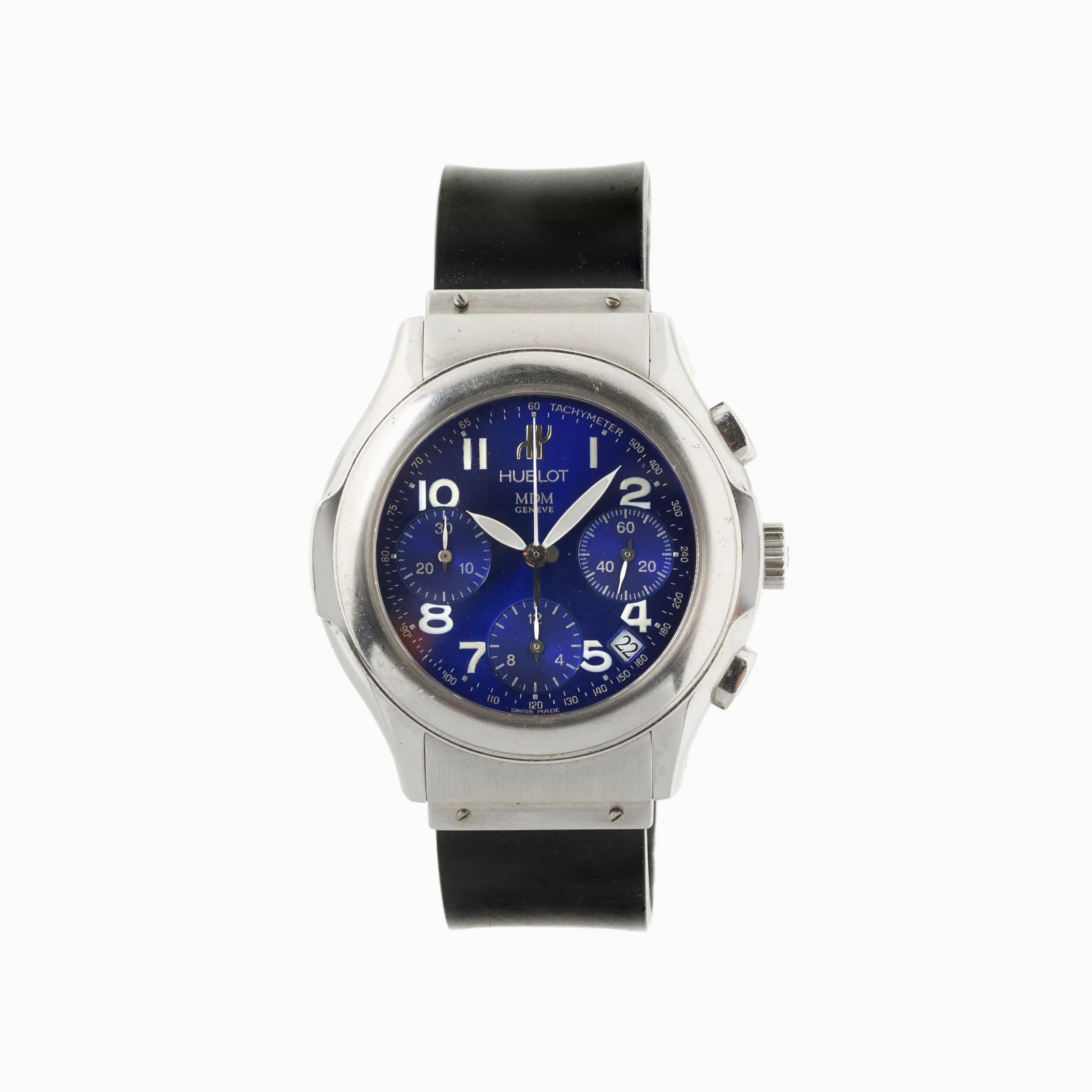 cassa in acciaio, fondello serrato con viti, tasti del crono a oliva, corona marcata, quadrante blu, grafica argento, scala tachimetrica, numeri arabi, tre contatori, secondi a ore, datario tra le quattro e le cinque, movimento a carica automatica, cinturino in gomma (difetti), lungh. interna cm 17, chiusura doppia deployant in acciaio marcata Hublot, vetro minerale. Diam. mm 40