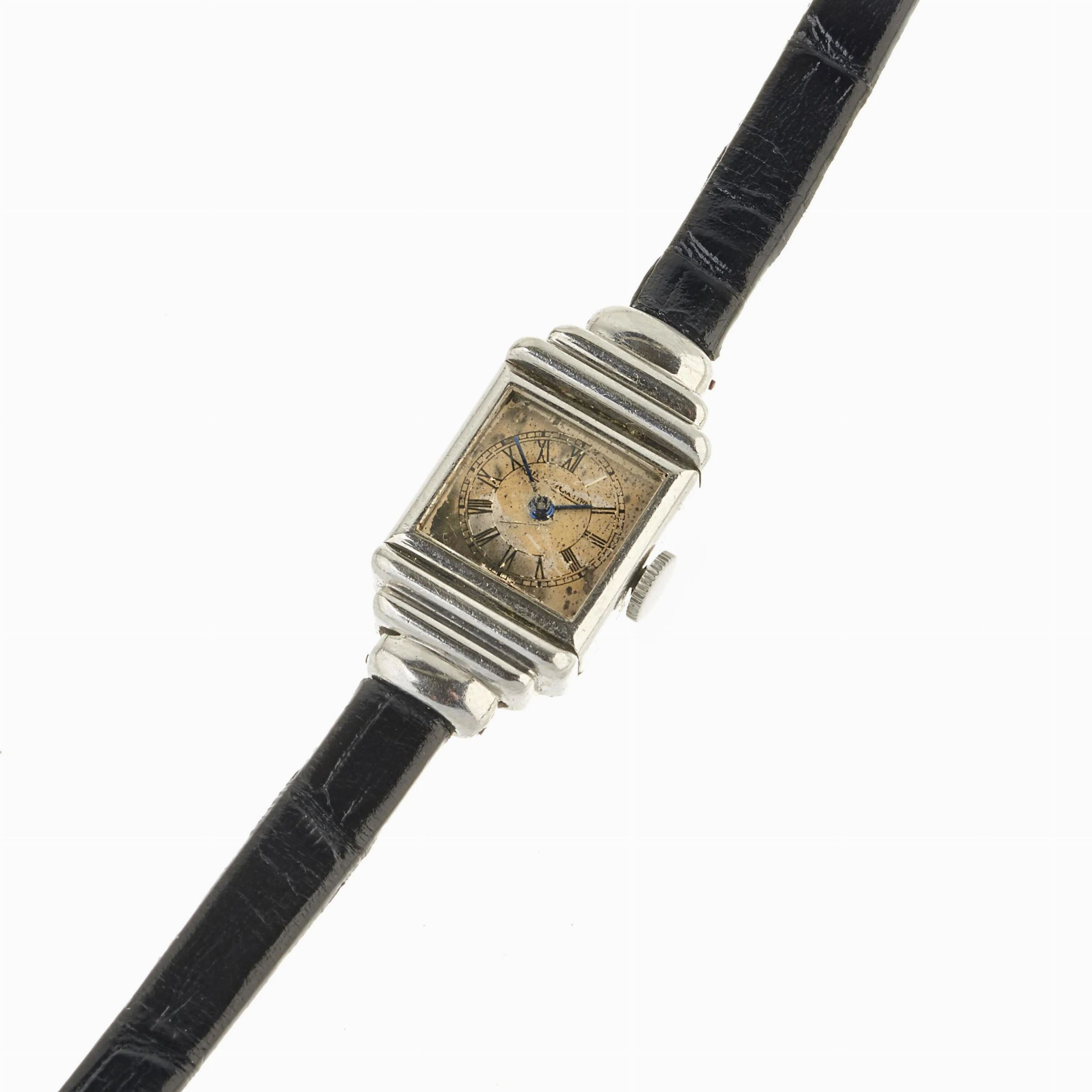 JAEGER LE COULTRE LADY cassa di forma in acciaio staybrite, fondello a pressione, anse a scomparsa, quadrante argentè (difetti) ristampato, numeri romani, movimento a carica manuale cal 407 n.130307, cinturino in pelle nera con fibbia in acciaio non originali, vetro minerale. Dim. mm 14x23