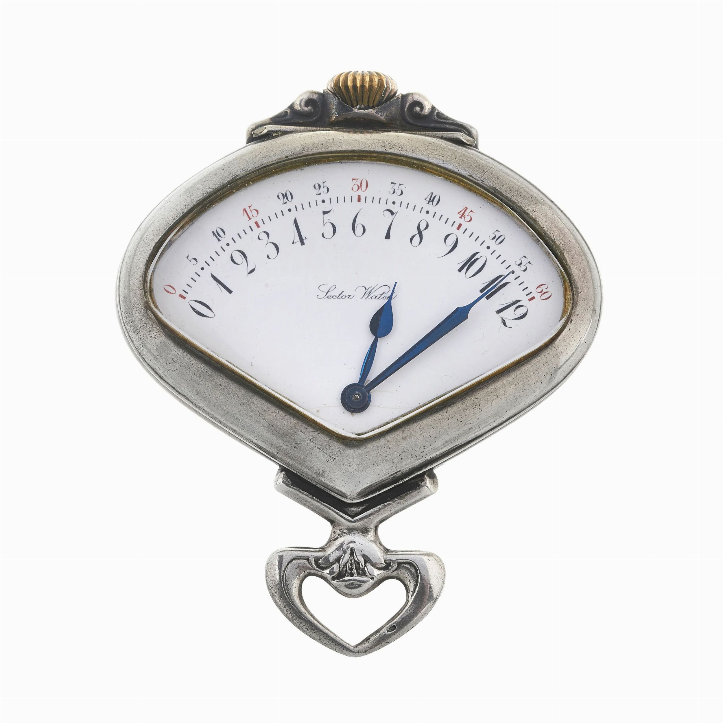 SECTOR WATCH OROLOGIO DA TASCA IN ARGENTO cassa di forma a ventaglio in due parti in argento 800, fondello esterno inciso e sbalzato raffigurante scena galante in una locanda, quadrante bianco in porcellana, grafica nera e rossa, numeri arabi, movimento a carica manuale, anello per catena sull'estremità inferiore, gr. 105. Dim. mm 58x50 (58x70 incluso anello).
