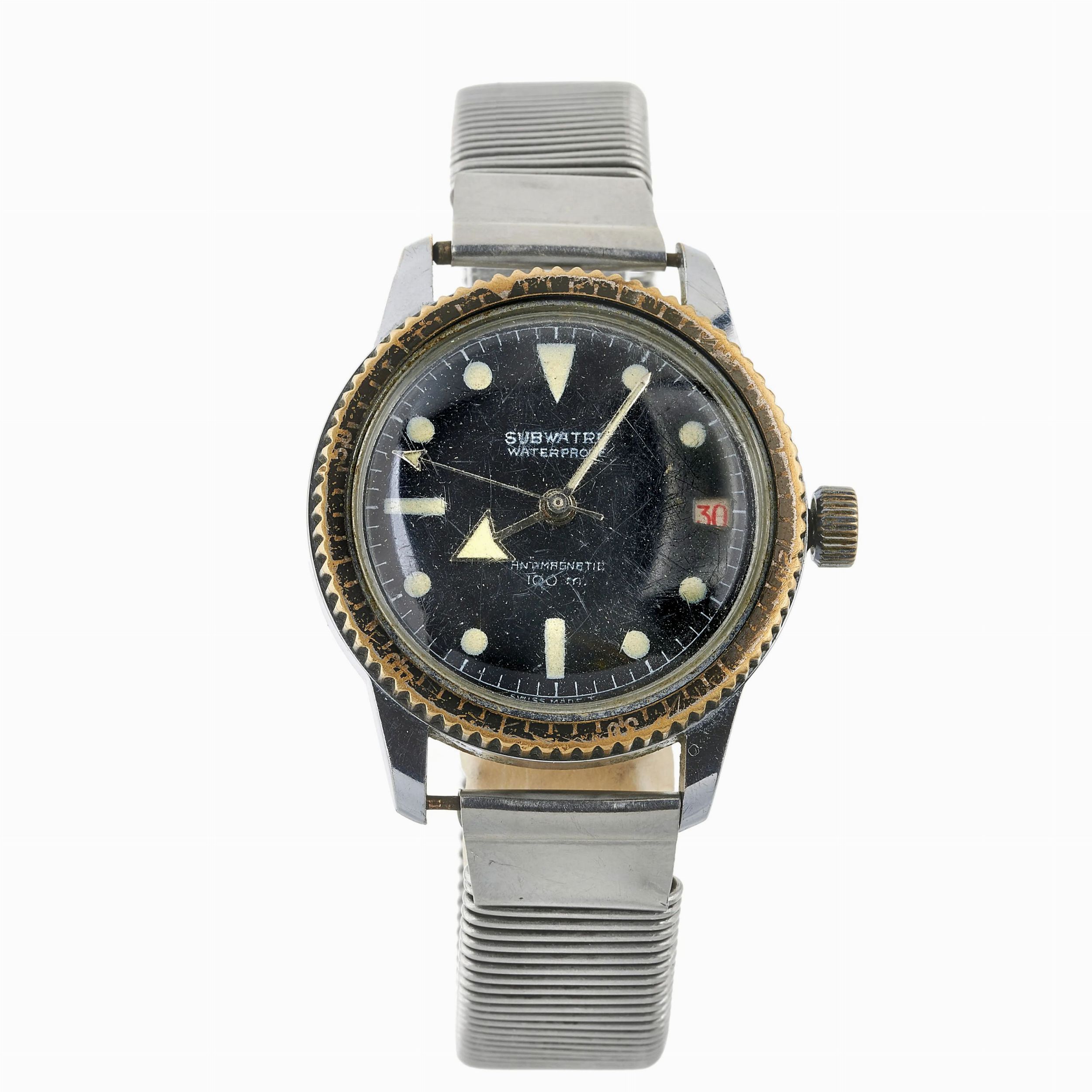 cassa in metallo, fondello a vite (difetti), ghiera girevole (difetti), quadrante nero, indici al trizio, datario a ore tre, movimento a carica manuale, bracciale elastico in metallo, vetro plastica. Diam. mm 35