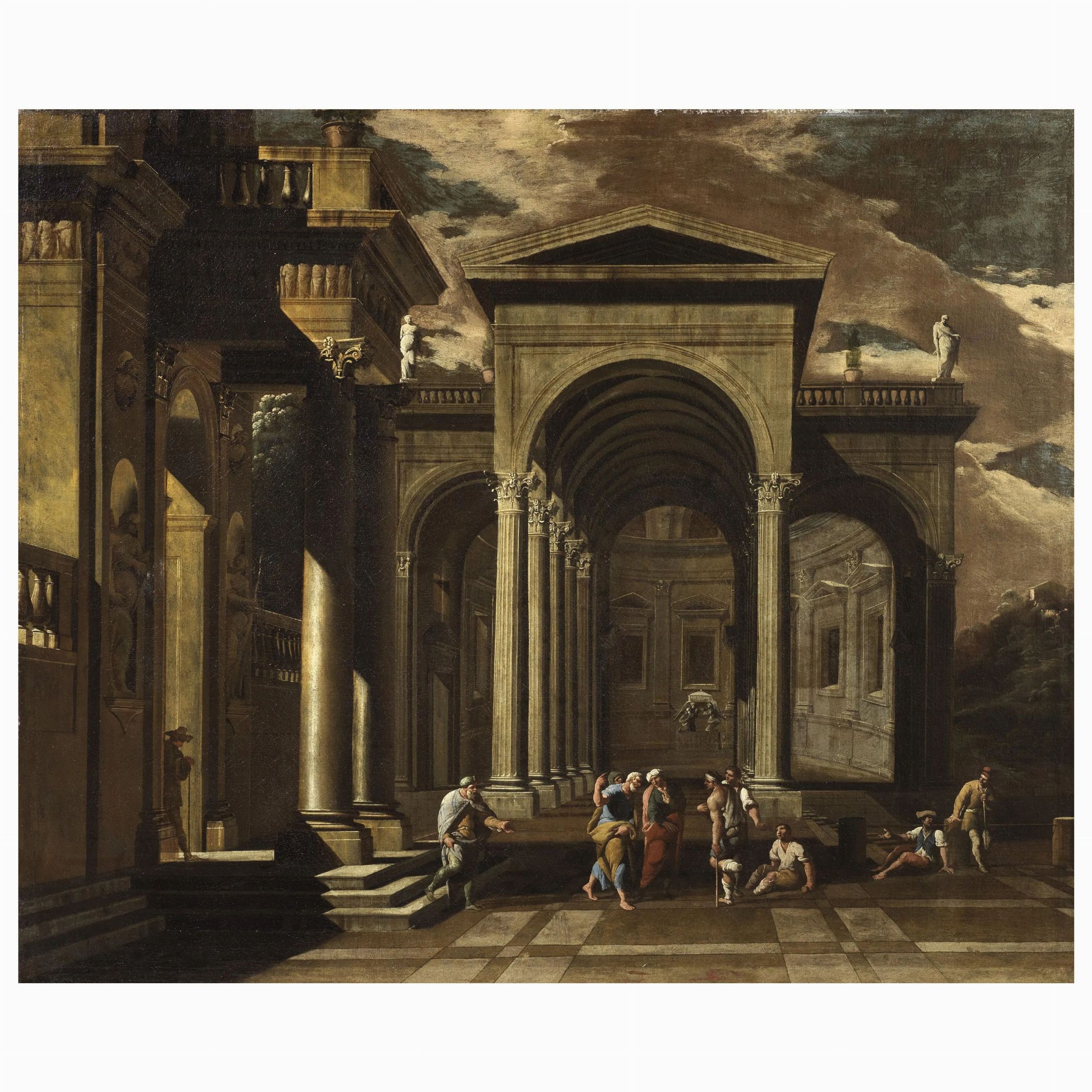 Nel corso della sua attività artistica, Viviano Codazzi (1604 - 1670) ha collaborato con diversi artisti. In particolare, durante il suo soggiorno napoletano verso il 1621, iniziò una cooperazione serrata con Domenico Gargiulo (1612- 1675), noto anche come Micco Spadaro. I due si specializzarono in generi distinti ma complementari: il primo nell'architettura, il secondo nella pittura di figura. Questa collaborazione diede vita a una vasta produzione di dipinti raffiguranti vedute di città, capricci architettonici e scene religiose. La prima opera eseguita in collaborazione è Le rovine del tempio del 1621 circa, un olio su tela conservato al Walters Art Museum di Baltimora. Per corroborare l'attribuzione a Codazzi e a Micco Spadaro, la nostra opera può essere confrontata con il dipinto raffigurante la Strage degli Innocenti conservato presso la Collezione d'Arte della Banca d'Italia: l'architettura mostra chiaramente la cifra stilistica del primo, mentre la stesura veloce ma molto accurata e la ricca espressività gestuale che lega in modo armonico i gruppi di figure allo spazio sono caratteristiche della maestria del secondo.