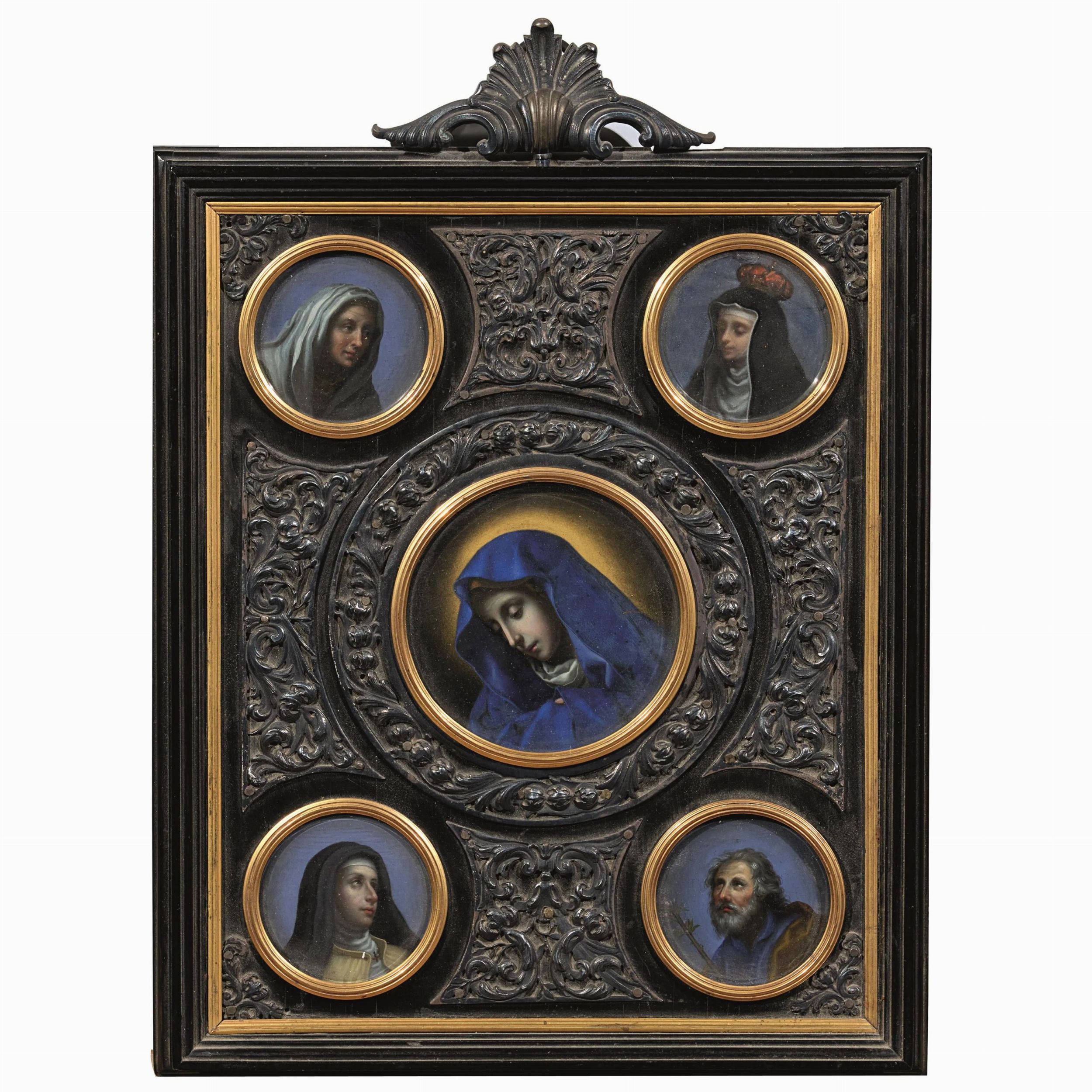 Bartolomeo Mancini (Firenze 1630 ca - Roma 1715) MADONNA E SANTI cinque miniature olio su rame entro cornice, cm 34,5x25,5 inciso su due al retro 'Mancini 1691'