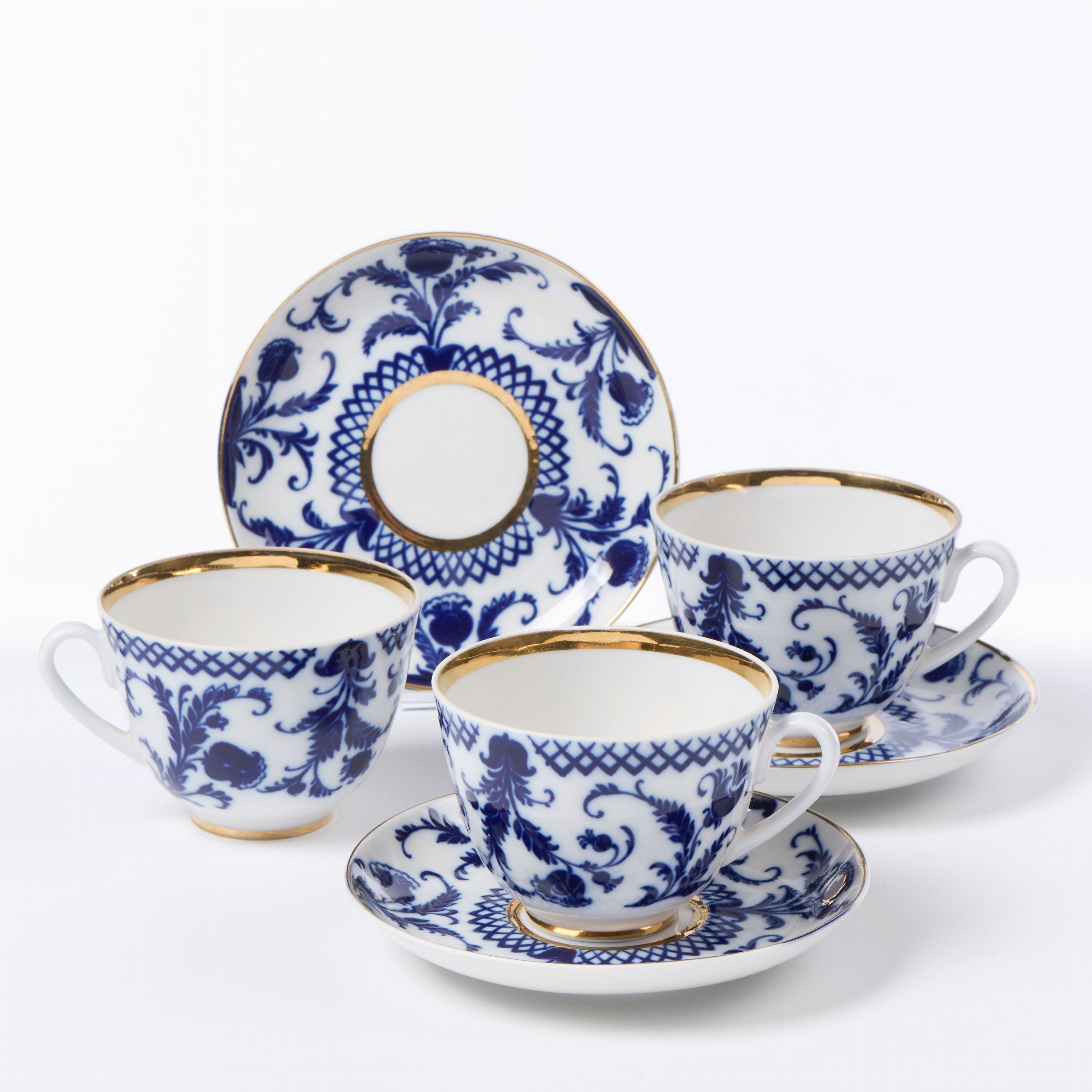 Lomonosov sei tazze da tè con piattino in porcellana bianca e blu
