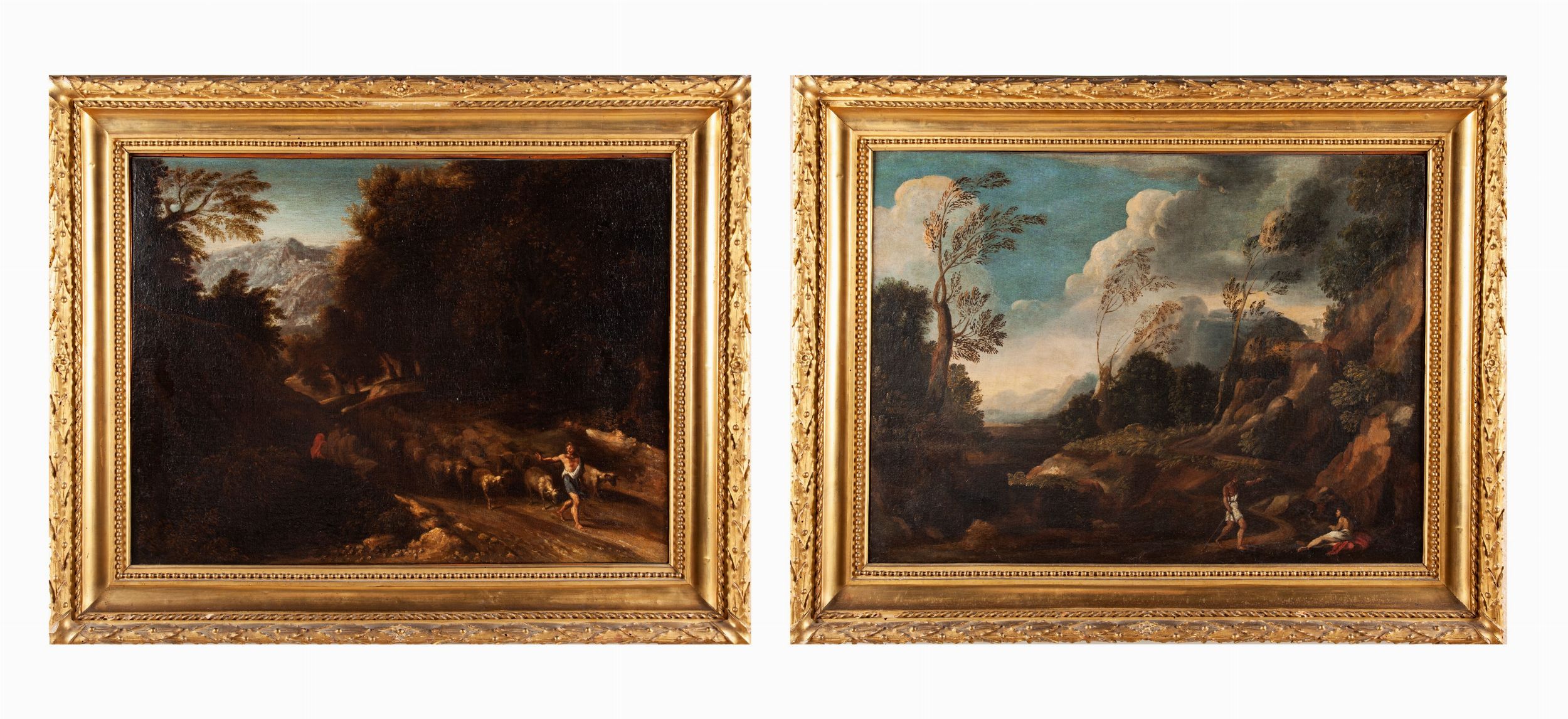 La coppia di paesaggi con figure si inserisce perfettamente in quella corrente artistica, iniziata a Roma da Carracci e i suoi scolari (come Francesco Albani), che poneva come punto cardinale nel dipinto il paesaggio e non più le figure umane. Nei nostri dipinti le figure che li animano sembrano essere aspetti secondari della composizione, mentre l’occhio dello spettatore si disperde tra le quinte architettoniche formate da arbusti, alberi agitati dal vento, nuvole che si stagliano su un cielo terso e rocce. Tra i più grandi interpreti di questo genere è da annoverare Gaspar Dughet, elegante artista di origine francese, assai vicino a Nicolas Poussin, che seppe conquistarsi un posto di prim’ordine con i suoi dipinti nelle gallerie principesche romane e non solo. Per la vicinanza stilistica i due paesaggi qui presentati dichiarano una evidente ascendenza nei confronti del Dughet, che ci induce ad attribuirli ad un suo stretto collaboratore.