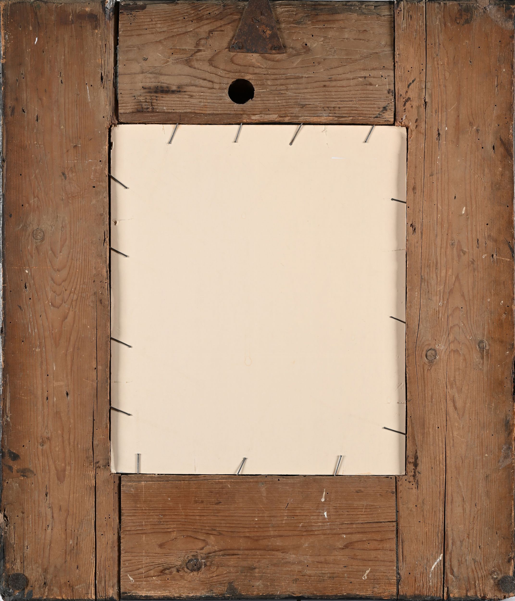 cm 11x9 - cm 42x32 - in cornice cm 77x66 residuo del cero pasquale sotto Giovanni Francesco Albani, pontefice col nome di Clemente XI dal 1700 al 1721; il medaglione è racchiuso in una cornice in filigrana dorata ad imitazione della più raffinata realizzazione orafa, costituita da ampie volute vegetali; tutt'intorno si dispongono tralci con corolle multiformi ed insetti eseguiti con inserti in tessuto e madreperla; cornice in legno ebanizzato con più ordini di intaglio a trottola e profili dorati
