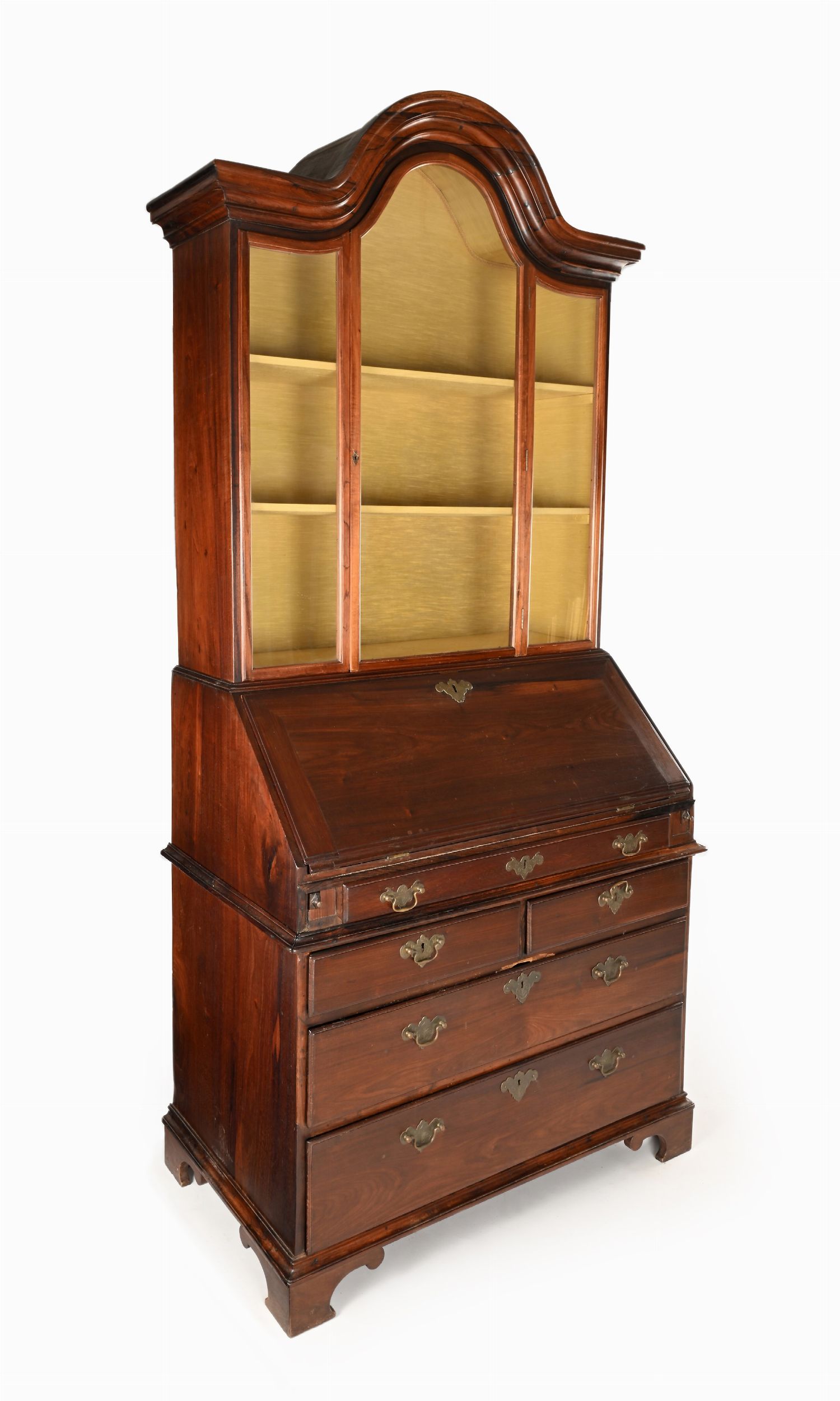 cm 225x104x58 - piano aperto cm 92 corpo superiore con anta a vetri e sommità centinata, all'interno della ribalta scomparti allineati e tiretti sagomati simmetricamente disposti ai lati di un'antina centrale; corpo inferiore con un cassetto nella fascia, due sottostanti allineati ed altri due in colonna con bocchette e maniglie in bronzo; piedi a mensola