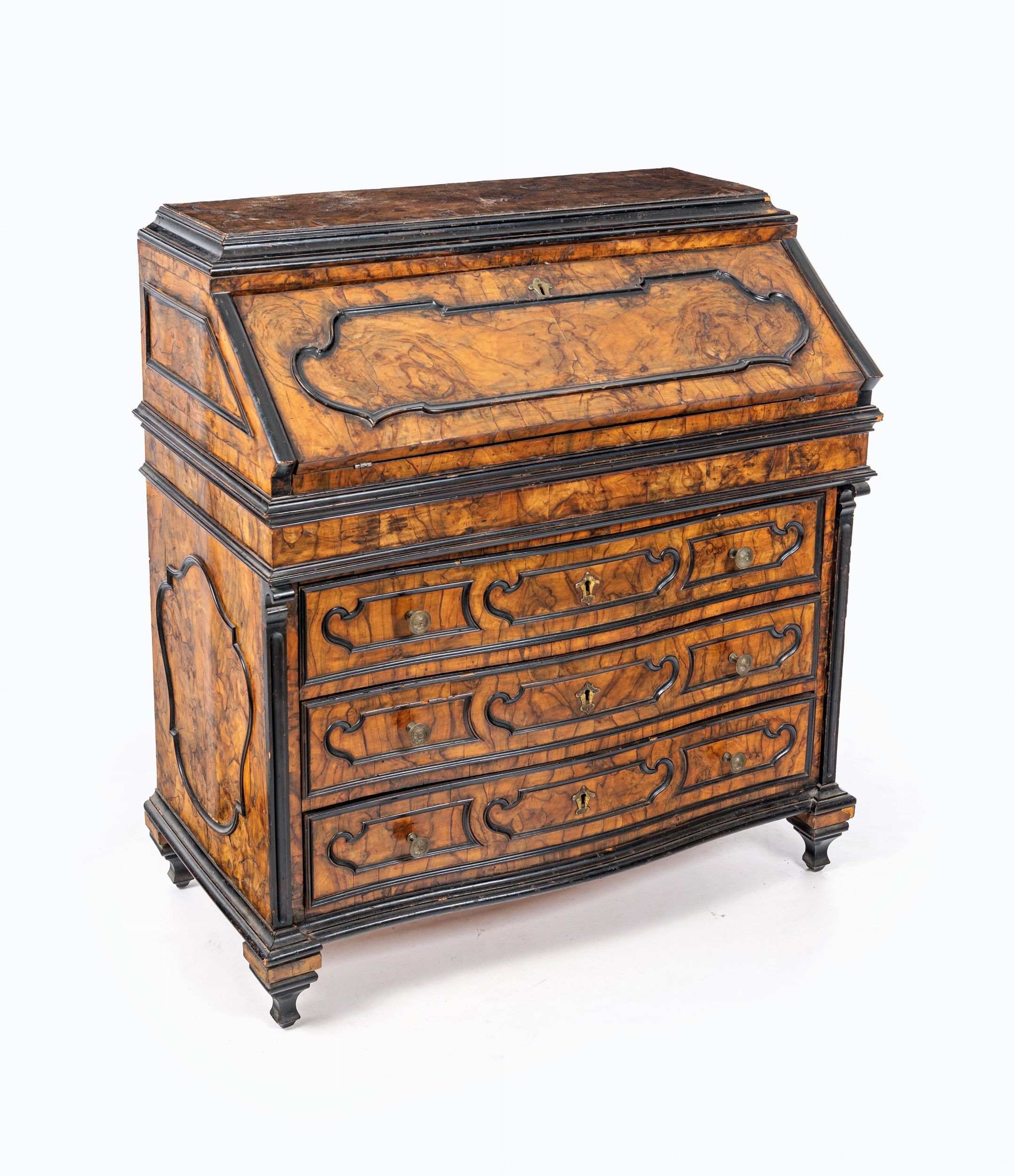 cm 113x105x55 con cornici sagomate ed ebanizzate disposte a creare riserve sagomate; la ribalta ospita sei cassetti ed un ripiano scorrevole a celare un ampio scomparto interno; tre cassetti frontali delimitati da lesene ebanizzate, piedi a pilastro. Difetti