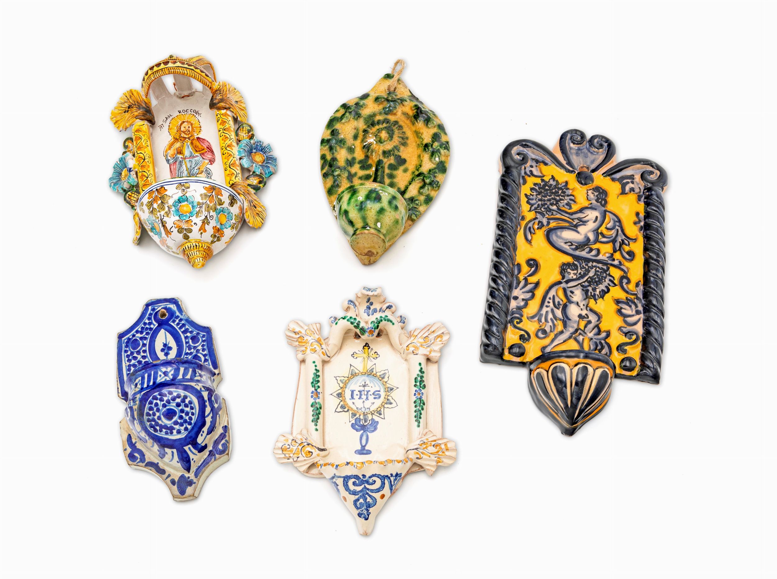 una raffigurante San Rocco, manifattura Domenico Caretta di Grottaglie (cm 22x15,5x7); una caratterizzata da cristogramma, manifattura Giuseppe de Fazio Grottaglie (cm 21x15x4,5); una con invetriatura noce e verde, fornace di Collesano (cm 21x12x6) ed una decorata in monocromia blu (cm 18,5x8,5x5,5); la quinta arte man Toledo (cm 30x15,5x5)