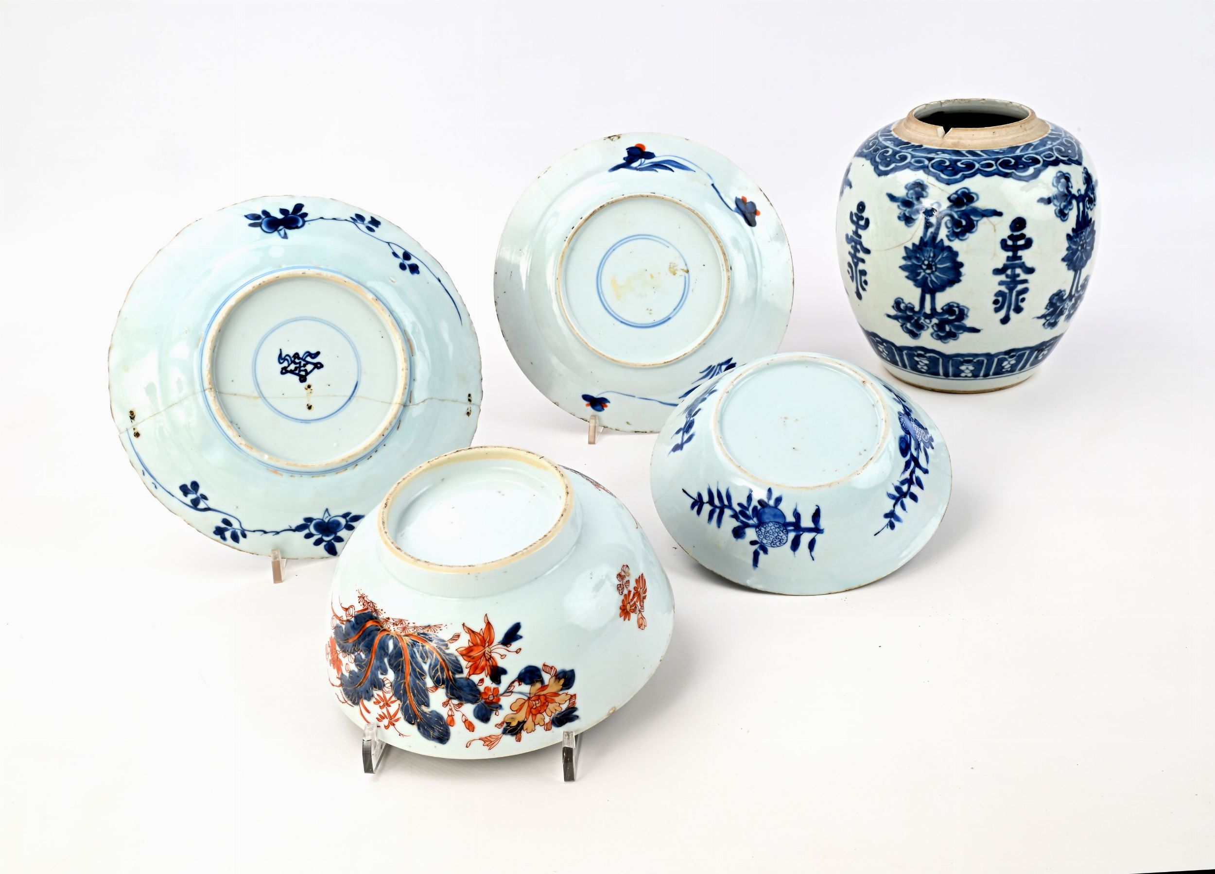 misure diverse ginger jar privo di coperchio (altezza cm 19), coppetta blu e bianca (cm 4,5x17,3), piatto blu e bianco (diametro cm 22), una ciotola e un piatto Imari (cm 7,5x18 e diametro cm 20,3 rispettivamente). Difetti e restauri