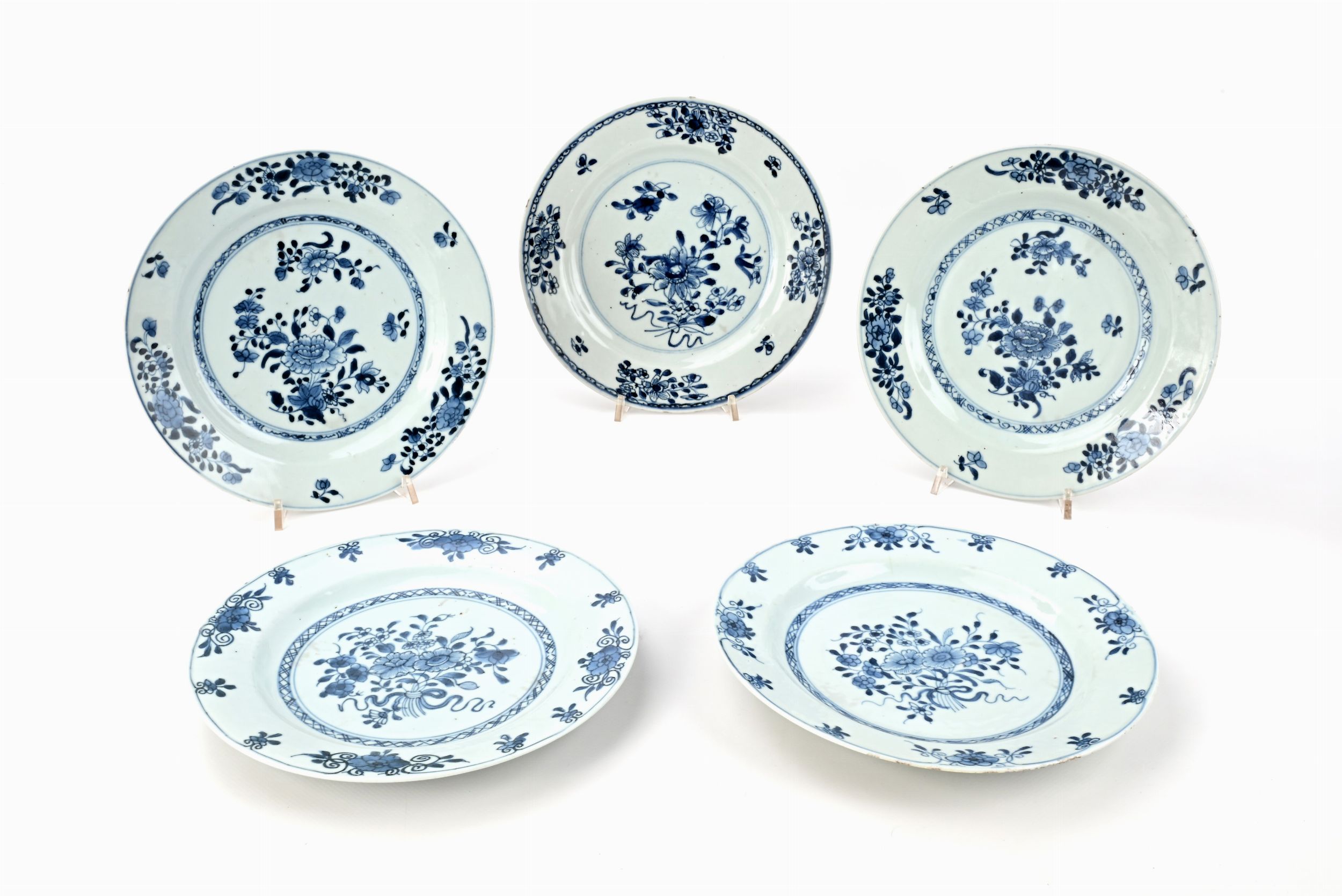 Cinque piatti in porcellana bianca e blu, Cina, XVIII secolo