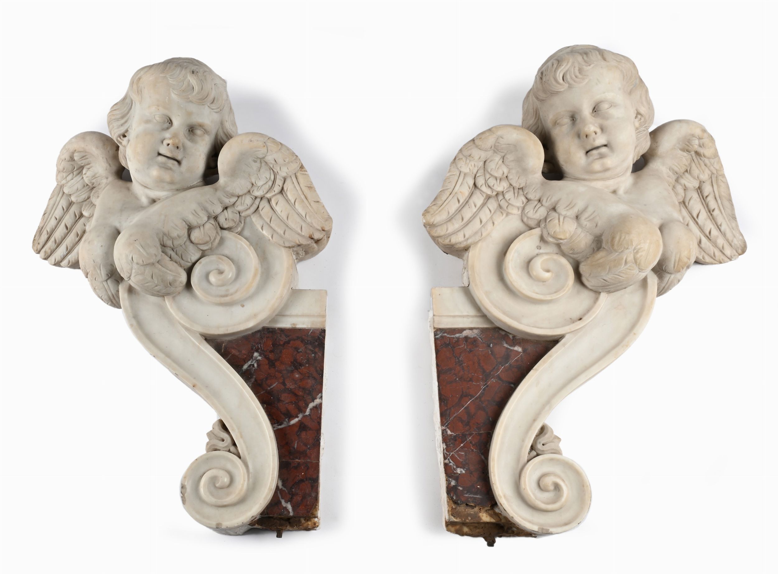 coppia di frammenti architettonici con figure di cherubino poggianti su elementi a ricciolo con inserto in marmo rosso antico