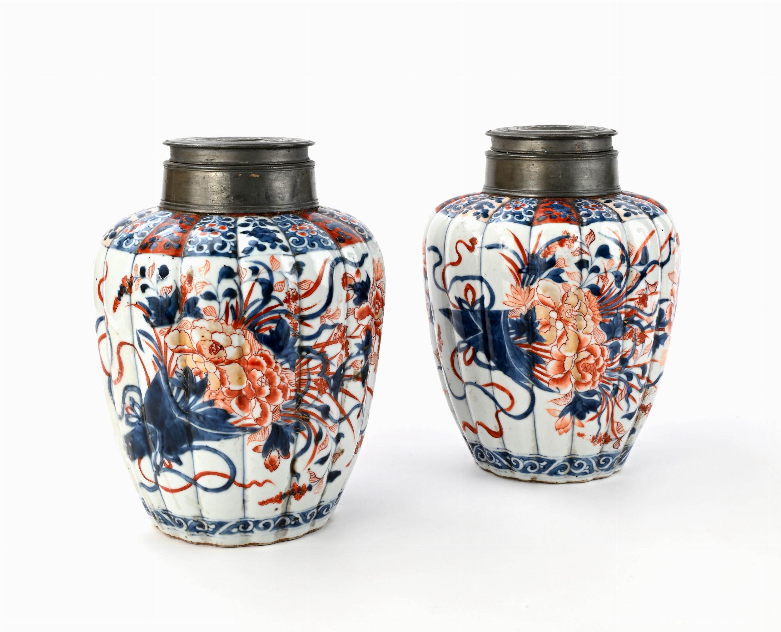 Coppia di ginger jars in porcellana Imari con chiusura in peltro, Cina, XVIII se [..]