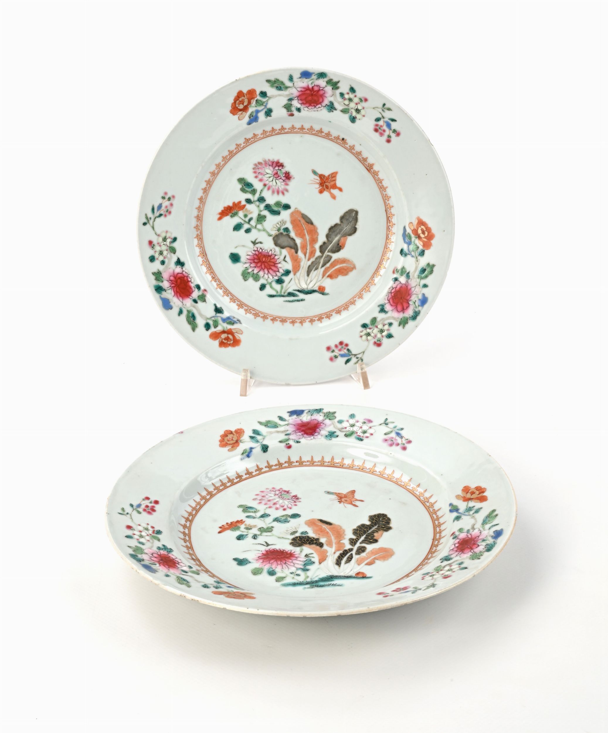 Coppia di piatti in porcellana policroma a motivi floreali, Compagnia delle Indie, [..]