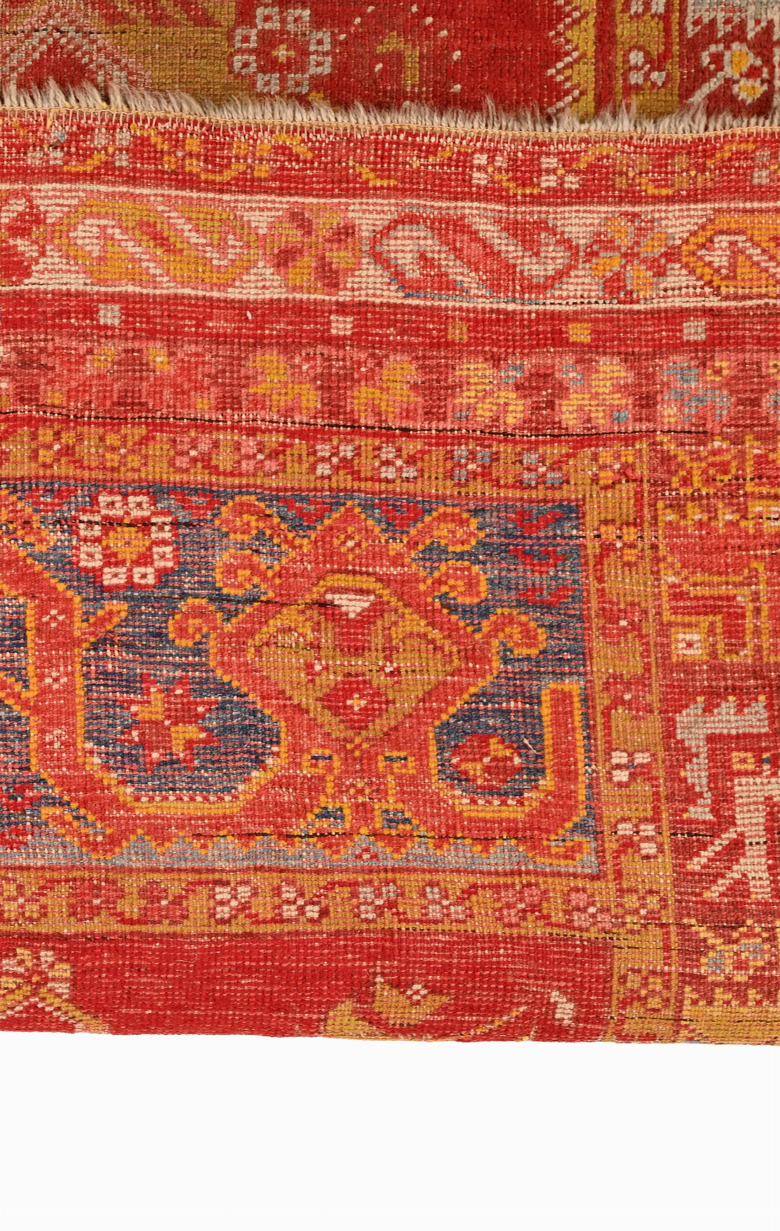 cm 180x110 e cm 177x109 Questa coppia di tappeti anatolici rappresenta un classico esempio della produzione tessile dell’Anatolia occidentale, in particolare delle aree di Konya, Gördes o Kirsehir. Il disegno centrale è caratterizzato da un grande medaglione a losanga con contorni a gradini, una tipologia decorativa comune nei tappeti prodotti in queste regioni. Il campo principale, in rosso caldo, è arricchito da piccoli motivi floreali e geometrici. Le bordature presentano un repertorio decorativo tipico dell’Anatolia: elementi a ganci angolari, motivi a meandro e simboli stilizzati, spesso associati alla protezione e alla spiritualità nelle culture consunti