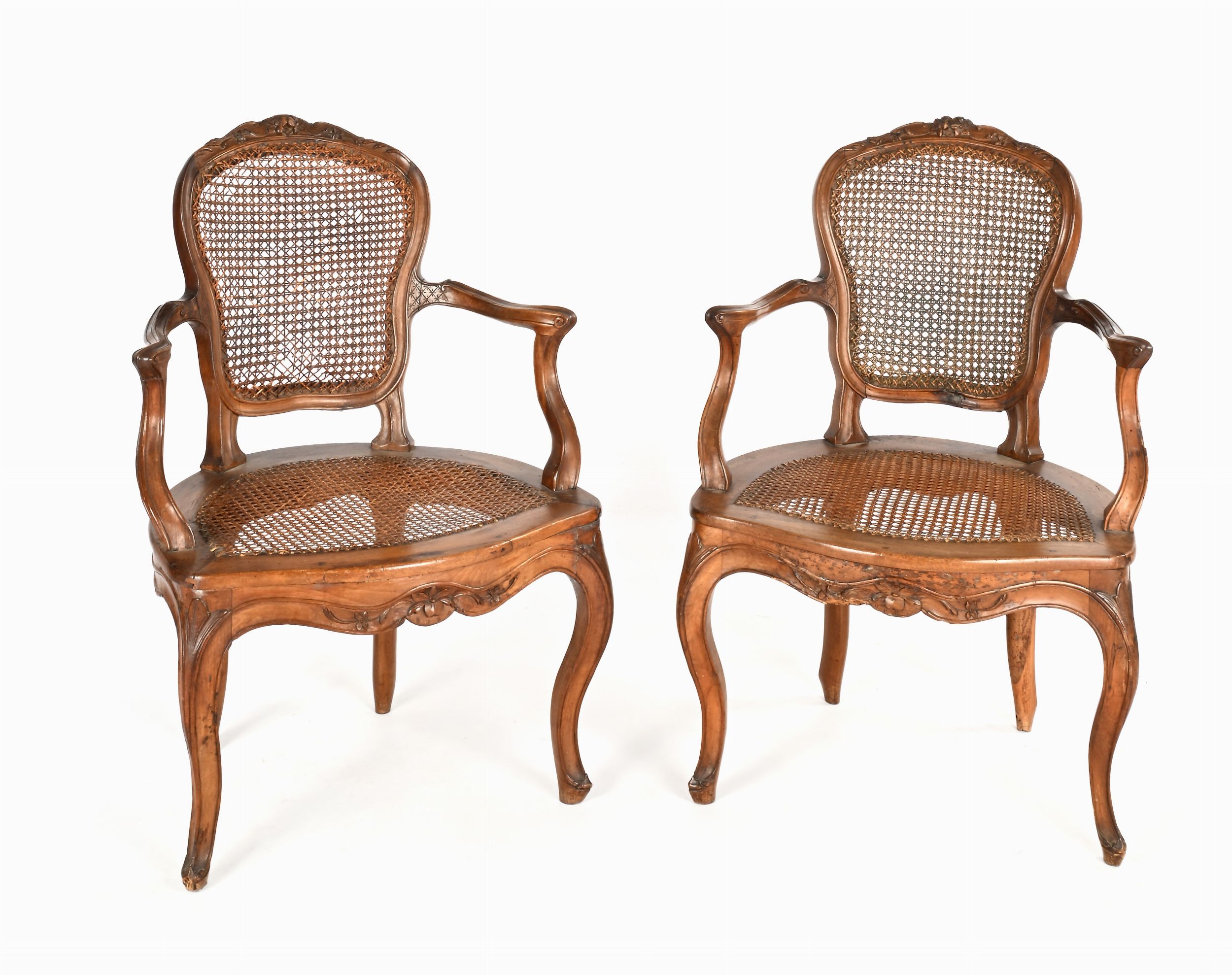 Coppia di poltroncine in noce e paglia di Vienna d'epoca Luigi XV