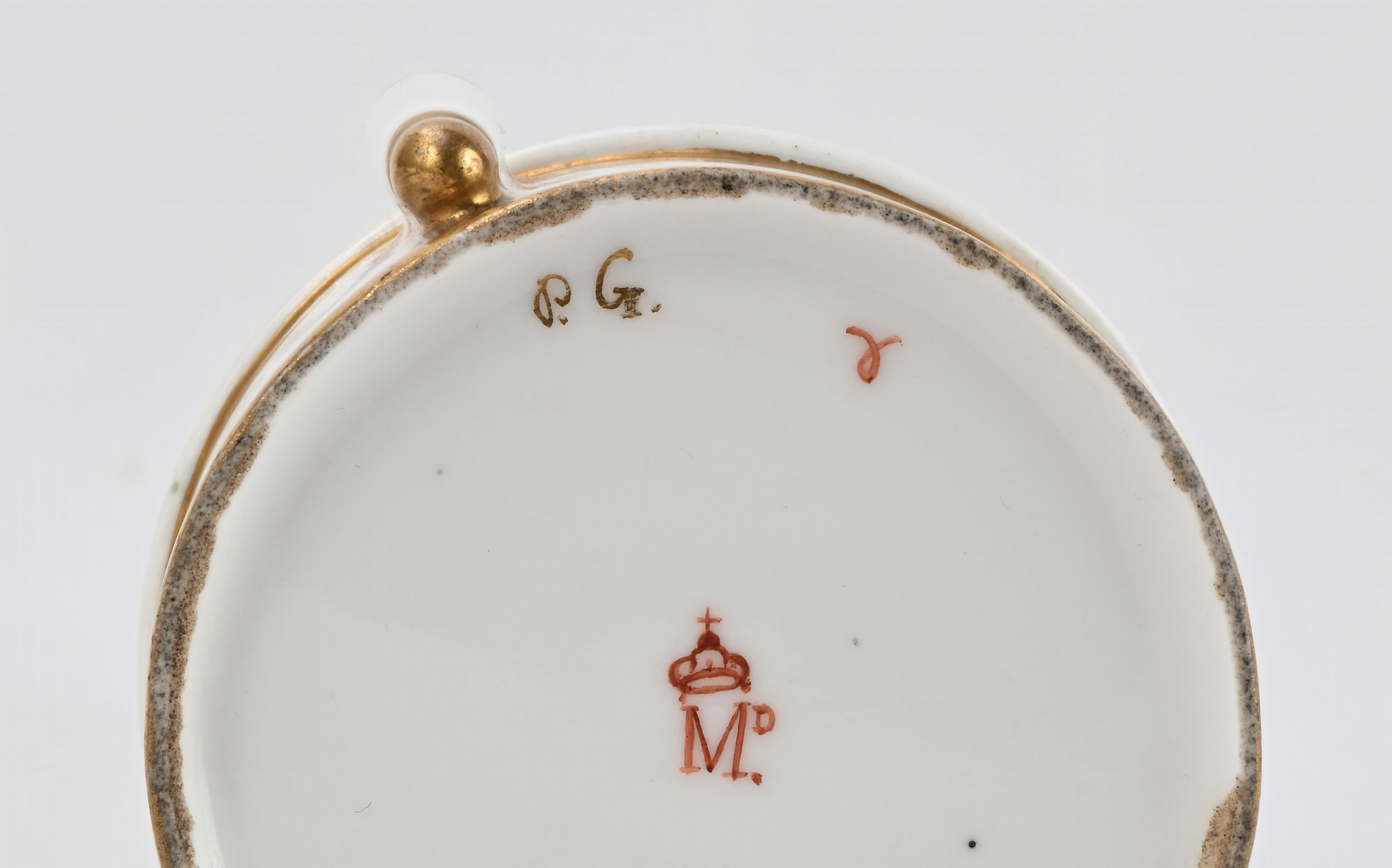 calamaio circolare in porcellana bianca e oro (cm 5x10x8,5), doratura consunta, e un piccolo bowl a motivi floreali (cm 5,3x8,7) lievi sbeccature lungo la base