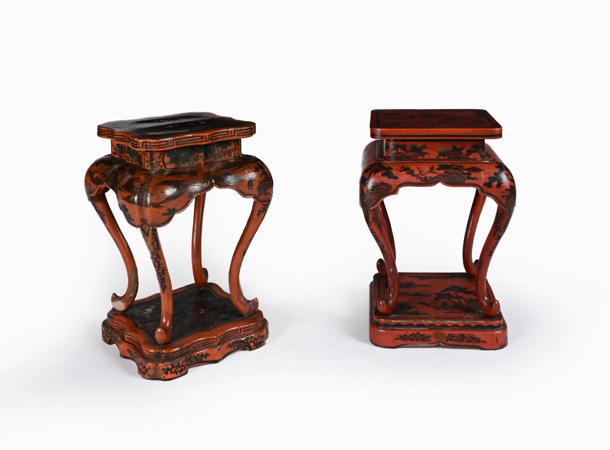 Due piccoli sgabelli in legno laccato rosso e nero, Cina, dinastia Qing, XIX sec [..]