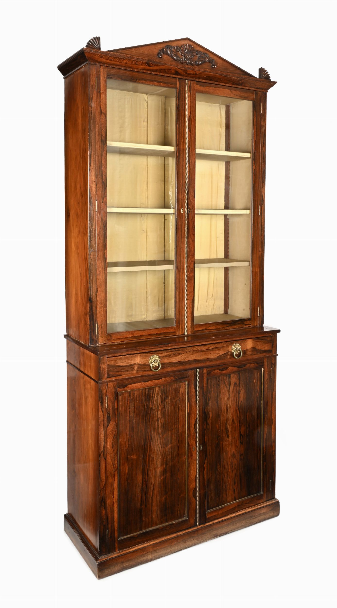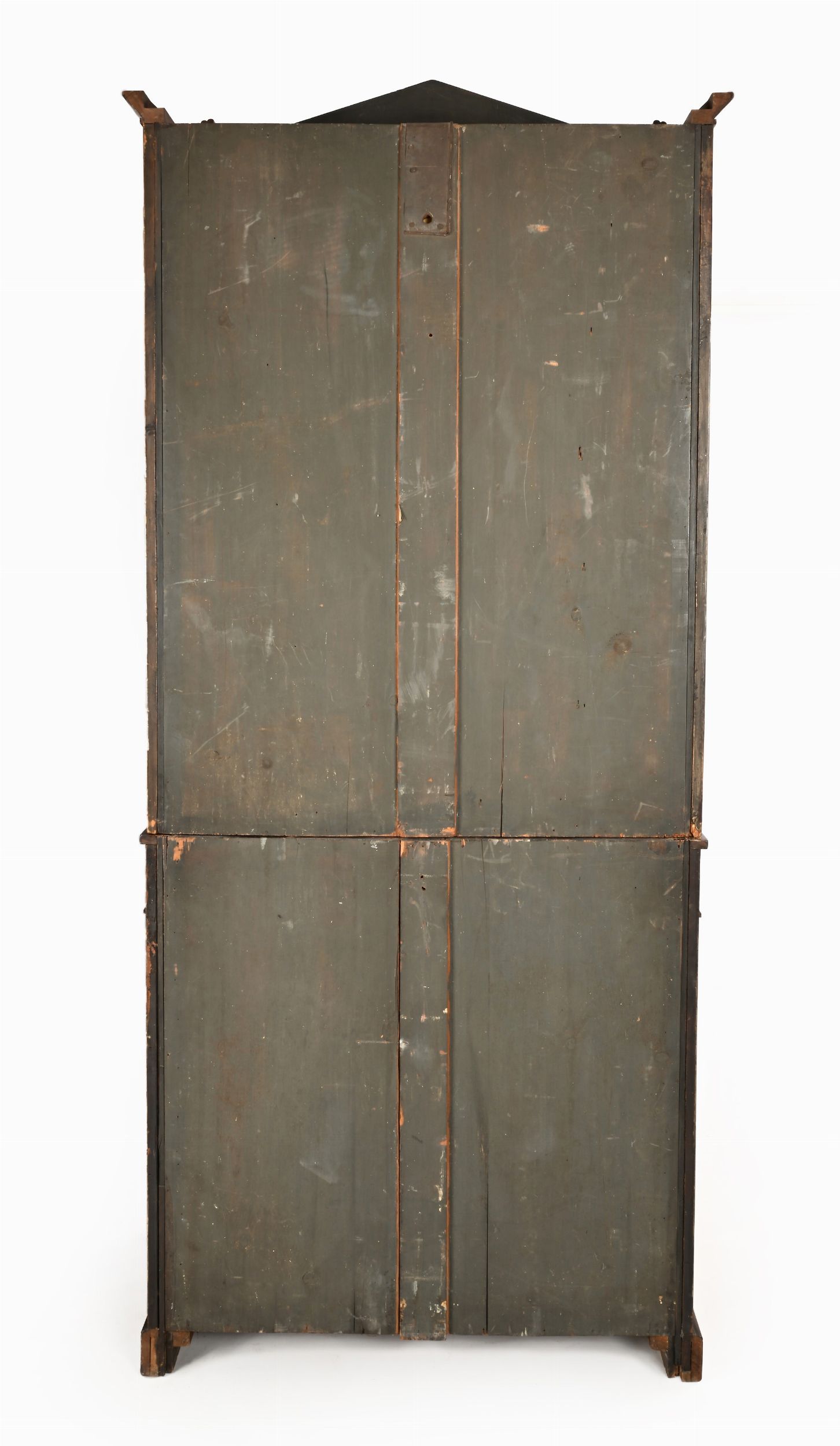 cm 222,5x93x42 cimasa a forma di timpano centrato da un ornamento intagliato ed applicato, delimitato da due fregi angolari a forma di ventaglio; due ante a vetri con ripiani interni nella parte superiore, un cassetto nella fascia e due sportelli sottostanti