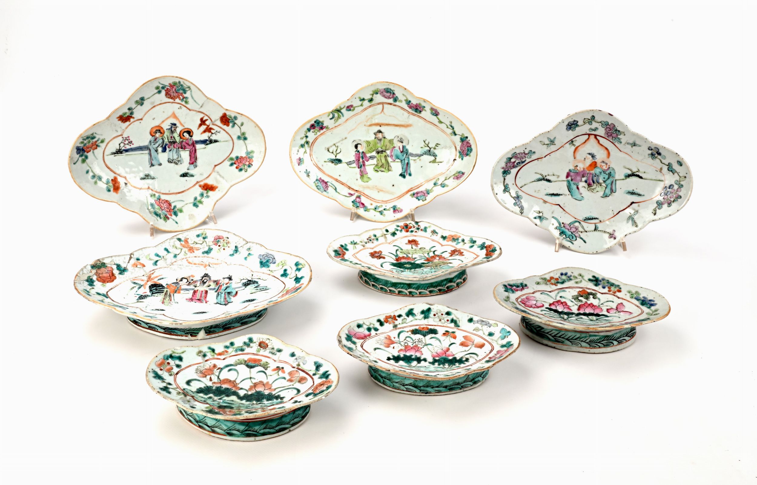 Otto alzatine porta condimento in porcellana policroma di due misure, Cina, XIX [..]