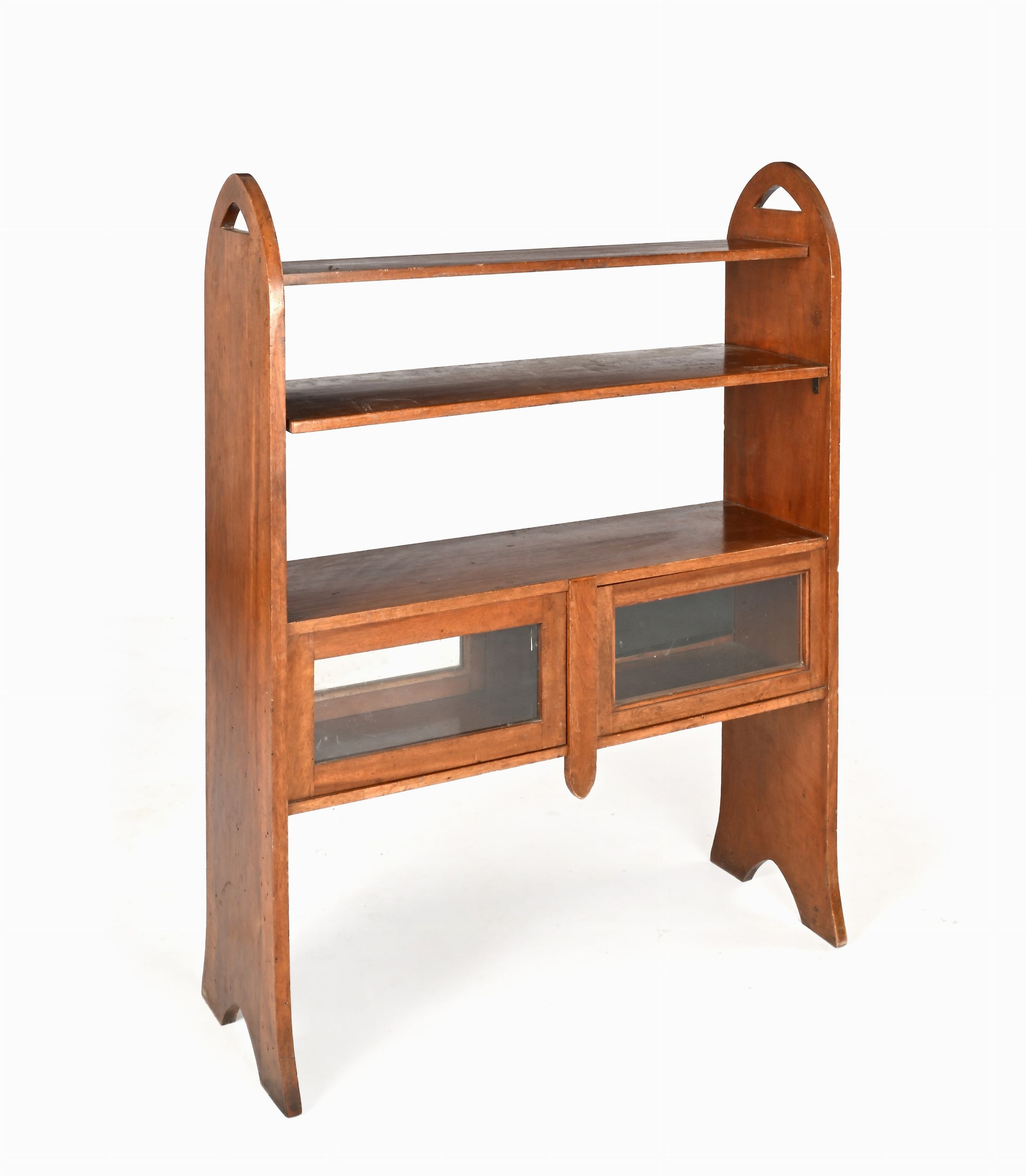 tre ripiani a giorno e due antine a vetro sottostanti disposte su entrambe le facciate. Un vetro mancante